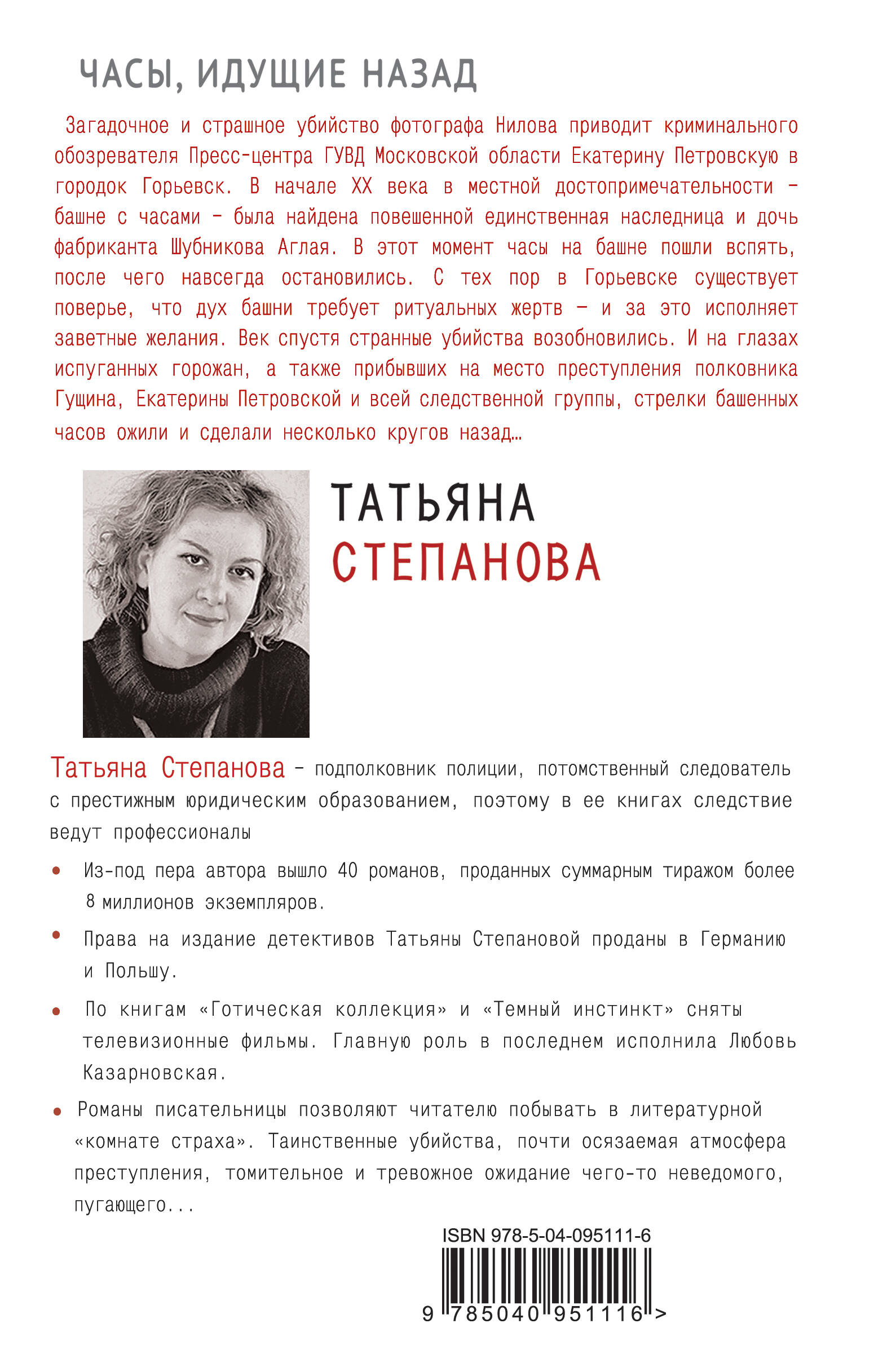 Загадочное и страшное убийство фотографа Нилова приводит криминального обозревателя Пресс-центра ГУВД Московской области Екатерину Петровскую в городок Горьевск. В начале XX века в местной достопримечательности - башне с часами - была найдена повешенной единственная наследница и дочь фабриканта Шубникова Аглая. В этот момент часы на башне пошли вспять, после чего навсегда остановились. С тех пор в Горьевске существует поверье, что дух башни требует ритуальных жертв - и за это исполняет заветные желания. Век спустя странные убийства возобновились. И на глазах испуганных горожан, а также прибывших на место преступления полковника Гущина, Екатерины Петровской и всей следственной группы, стрелки башенных часов ожили и сделали несколько кругов назад…| Издательство | ООО "Издательство "Эксмо" |