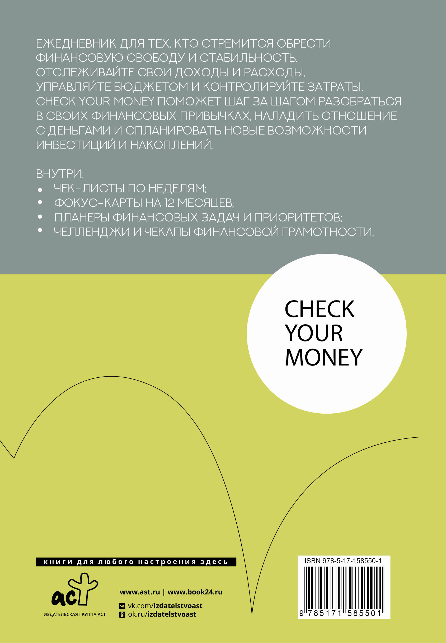 Ежедневник для тех, кто стремится обрести финансовую свободу и стабильность. Отслеживайте свои доходы и расходы, управляйте бюджетом и контролируйте затраты. Check your money поможет шаг за шагом разобраться в своих финансовых привычках, наладить отношение с деньгами, спланировать новые возможности инвестиций и накоплений. Внутри: • чек-листы по неделям; • фокус-карты на 12 месяцев; • планеры финансовых задач и приоритетов; • челленджи и чекапы финансовой грамотности.| Издательство | Издательство "АСТ" |