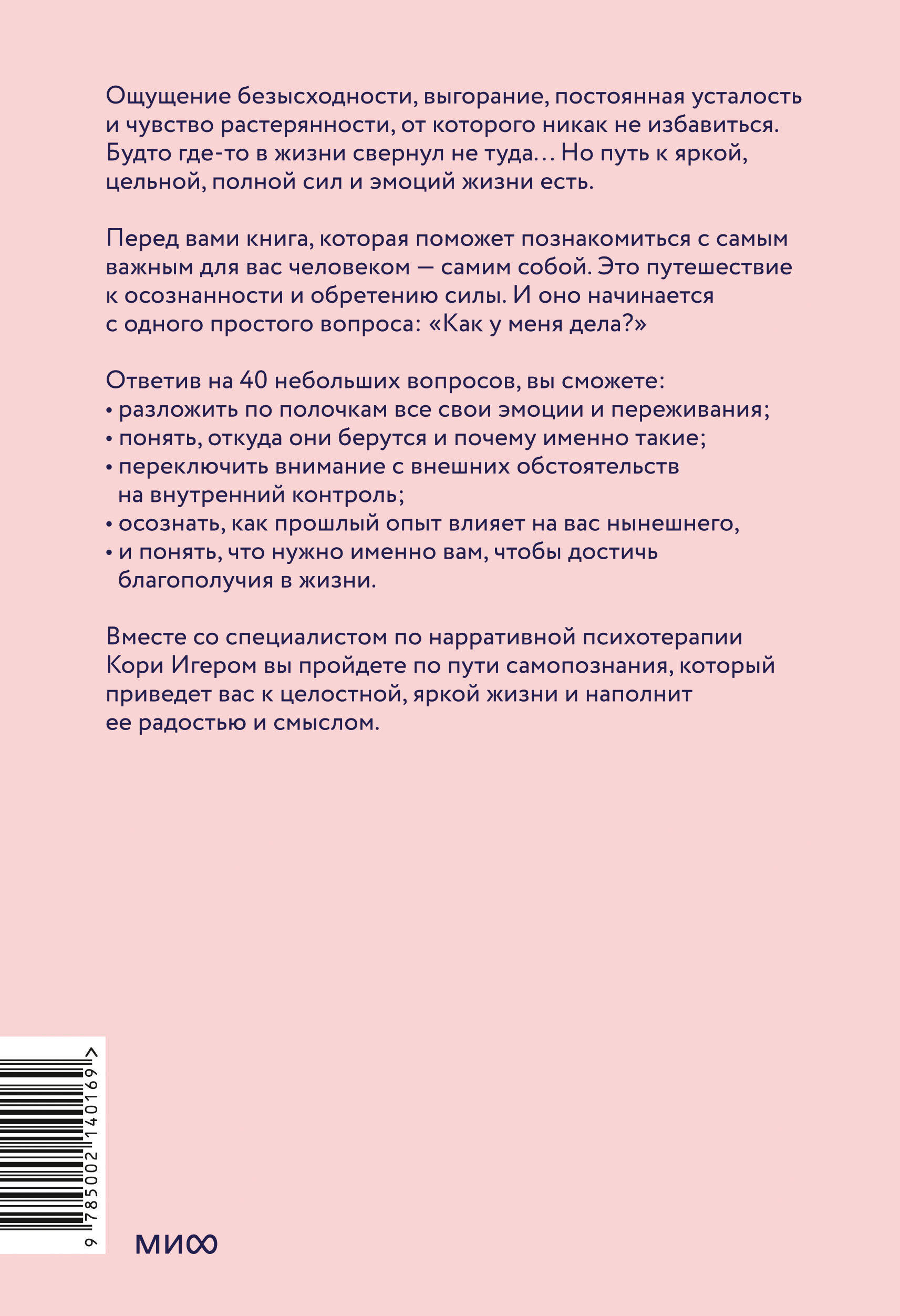 В этой книге - 40 небольших, но важных вопросов от психотерапевта, которые познакомят вас с самым интересным человеком - самим собой. Ощущение безысходности, выгорание, постоянная усталость и чувство растерянности, от которого никак не избавиться. Будто где-то свернул не туда… Но путь к яркой, цельной, полной сил и эмоций жизни есть. Перед вами книга, которая поможет вам познакомиться с самим собой. Это путешествие к осознанности и обретению силы. И оно начинается с одного простого вопроса: "Как у меня дела?". Ответив на 40 вопросов, вы сможете: разложить по полочкам все свои эмоции и переживания; понять, откуда они берутся и почему именно такие; переключить внимание с внешних обстоятельств на внутренний контроль; осознать, как прошлый опыт влияет на вас нынешнего; понять, что нужно именно вам, чтобы достичь благополучия в жизни. В каждой главе помимо вопросов вы найдете краткие, но при этом глубокие размышления автора, а также подсказки, упражнения и конкретные темы, над которыми стоит подумать. Вместе со специалистом по нарративной психотерапии Кори Игером вы пройдете по пути самопознания, который приведет вас к целостной, яркой жизни и наполнит ее радостью и смыслом. Для кого эта книга: Для тех, кто ощущает потерянность в жизни и не понимает, куда двигаться дальше. Для всех, кто хочет лучше узнать себя.| Издательство | МАНН, ИВАНОВ И ФЕРБЕР ООО |