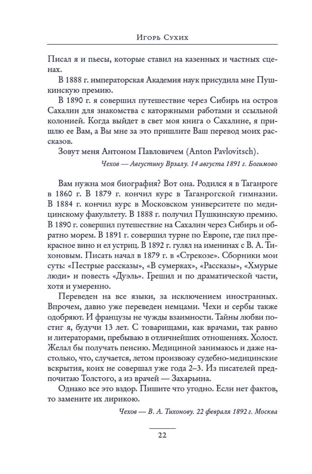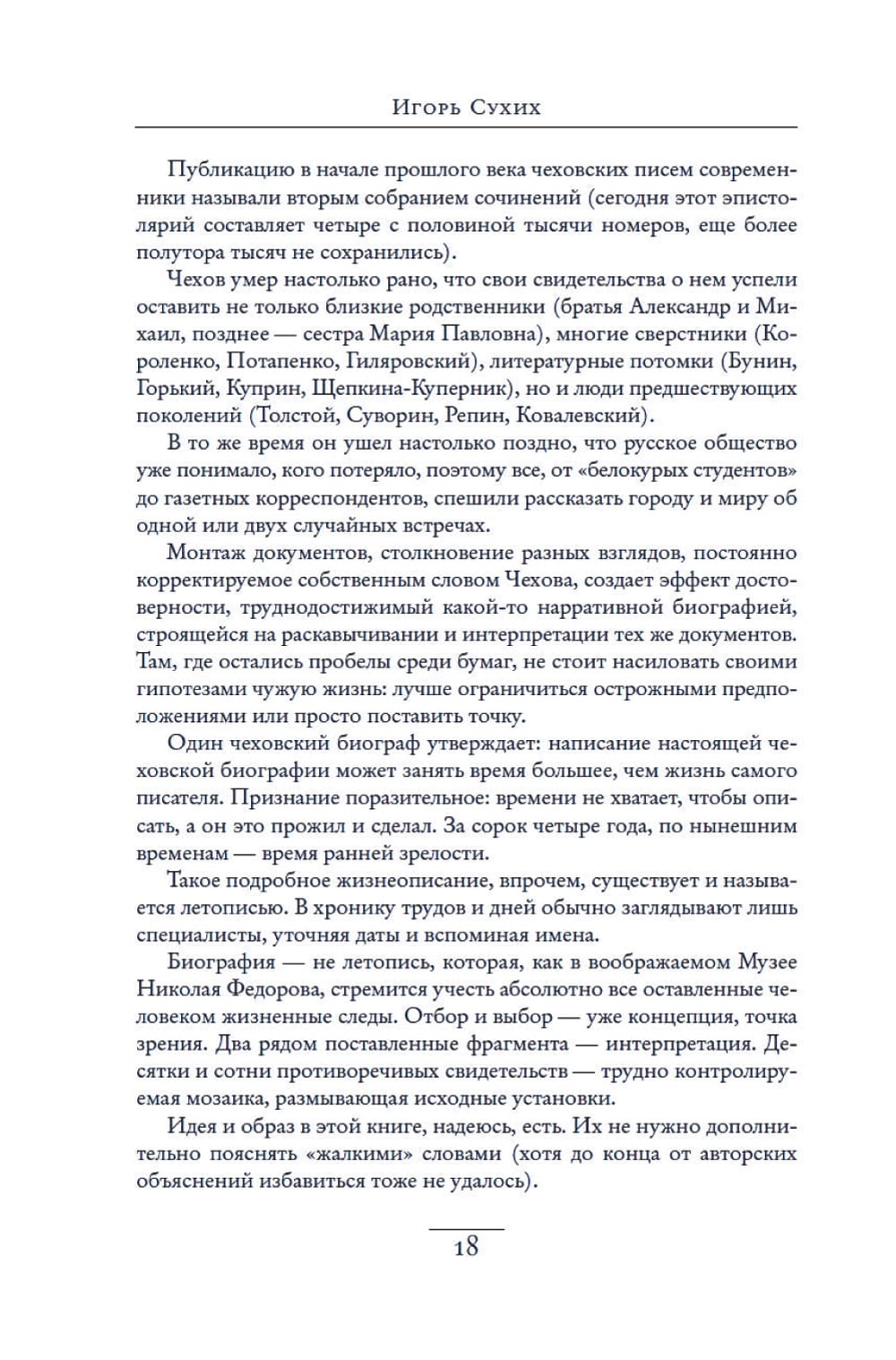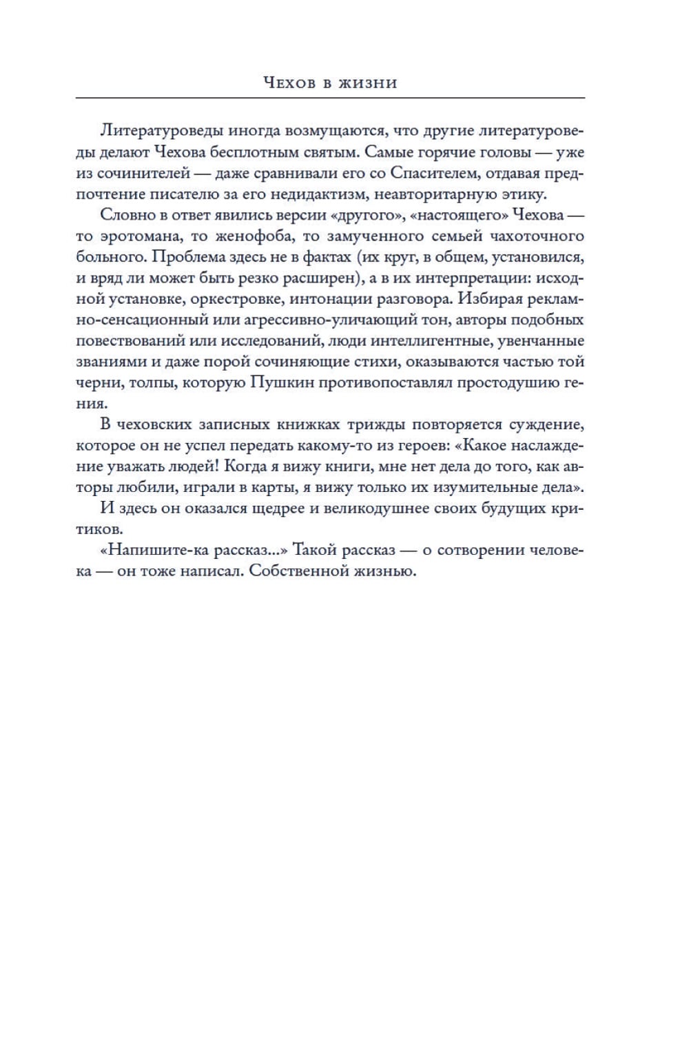 «Чехов в жизни» - книга, созданная в жанре документального монтажа. Образ А.П. Чехова складывается в ней из многочисленных, подчас противоречащих друг другу свидетельств его современников - родственников, друзей, знакомых. Портрет, характер, семья, учеба, вера, творчество, медицина и т. д. - в полусотне тематически организованных глав Чехов предстает в самых разных ипостасях: как достойный сын, трогательно заботившийся о родителях; как любимец друзей и женщин; как путешественник и садовод; как интересный собеседник и оригинальный мыслитель. Сквозным сюжетом повествования становится не разгадка мнимых чеховских загадок, а драма судьбы. Автор-составитель книги - Игорь Николаевич Сухих, известный литературовед, доктор филологических наук, профессор Санкт-Петербургского университета и один из лучших исследователей творчества Чехова.