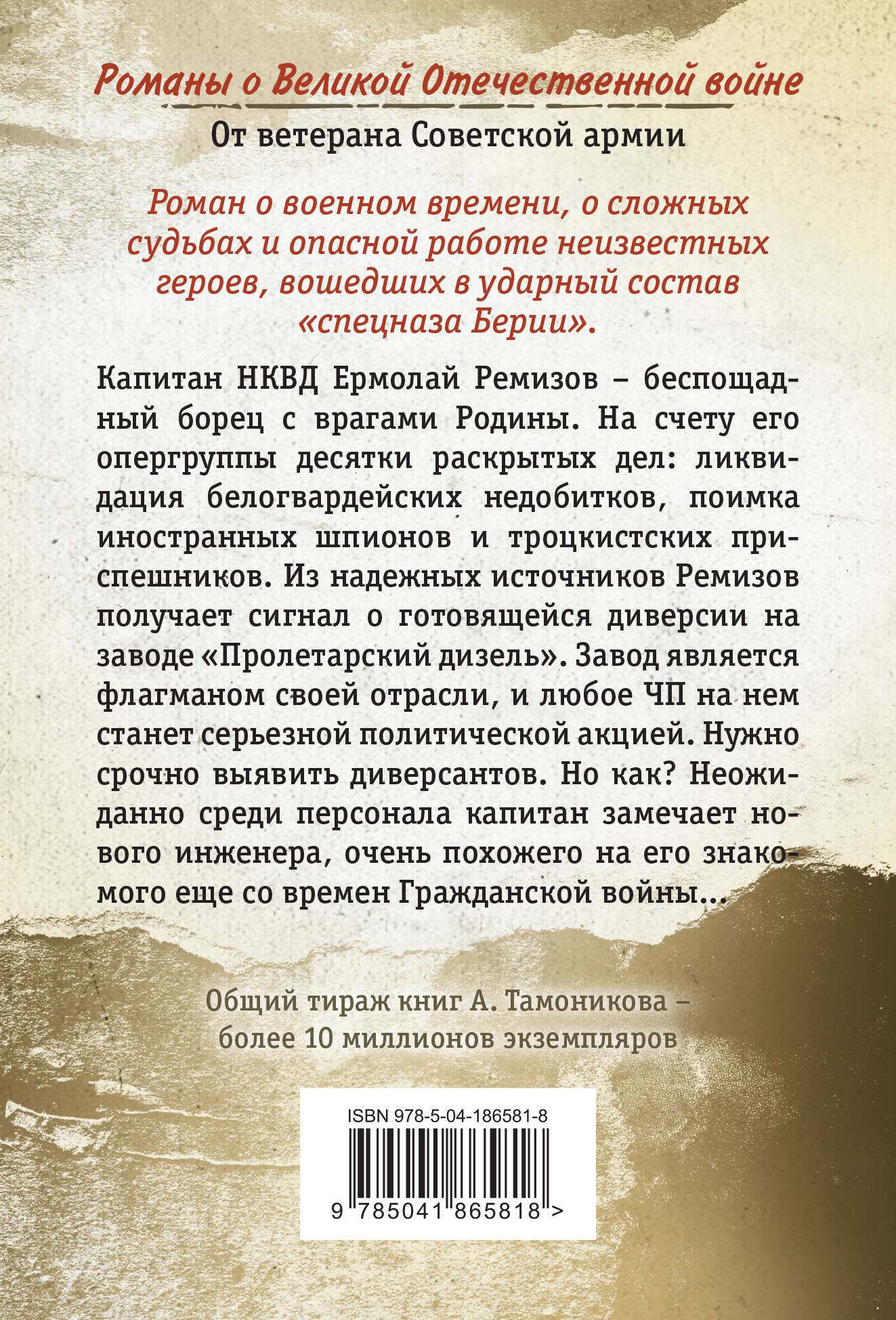 Роман о военном времени, о сложных судьбах и опасной работе неизвестных героев, вошедших в ударный состав «спецназа Берии». Общий тираж книг А. Тамоникова - более 10 миллионов экземпляров. Капитан НКВД Ермолай Ремизов - беспощадный борец с врагами Родины. На счету его опергруппы десятки раскрытых дел: ликвидация белогвардейских недобитков, поимка иностранных шпионов и троцкистских приспешников. Из надежных источников Ремизов получает сигнал о готовящейся диверсии на заводе «Пролетарский дизель». Завод является флагманом своей отрасли, и любое ЧП на нем станет серьезной политической акцией. Нужно срочно выявить диверсантов. Но как? Неожиданно среди персонала капитан замечает нового инженера, очень похожего на его знакомого еще со времен Гражданской войны…| Издательство | ООО "Издательство "Эксмо" |