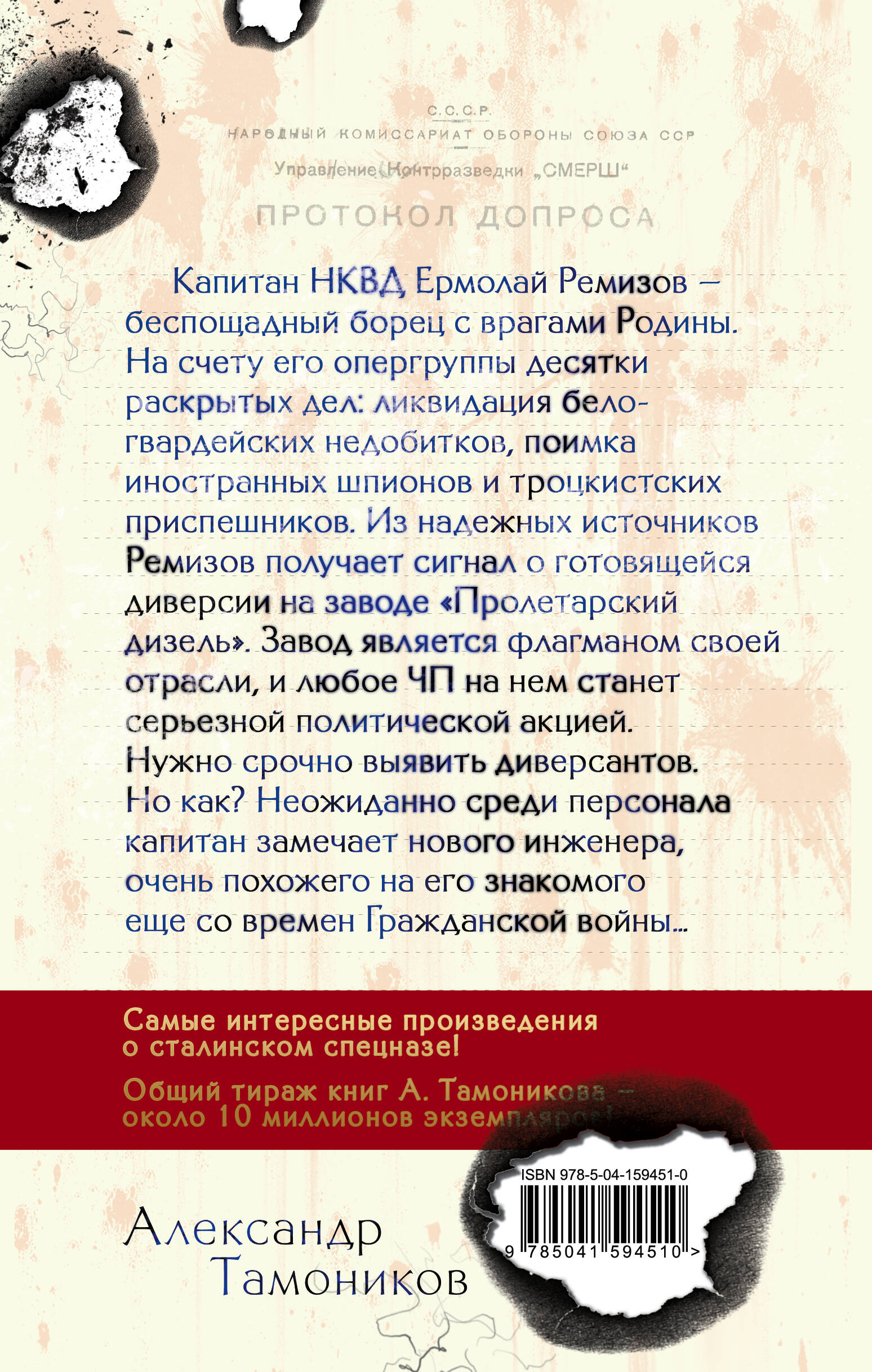 Роман о военном времени, о сложных судьбах и опасной работе неизвестных героев, вошедших в ударный состав «спецназа Берии». Общий тираж книг А. Тамоникова - более 10 миллионов экземпляров. Капитан НКВД Ермолай Ремизов - беспощадный борец с врагами Родины. На счету его опергруппы десятки раскрытых дел: ликвидация белогвардейских недобитков, поимка иностранных шпионов и троцкистских приспешников. Из надежных источников Ремизов получает сигнал о готовящейся диверсии на заводе «Пролетарский дизель». Завод является флагманом своей отрасли, и любое ЧП на нем станет серьезной политической акцией. Нужно срочно выявить диверсантов. Но как? Неожиданно среди персонала капитан замечает нового инженера, очень похожего на его знакомого еще со времен Гражданской войны…| Издательство | ООО "Издательство "Эксмо" |