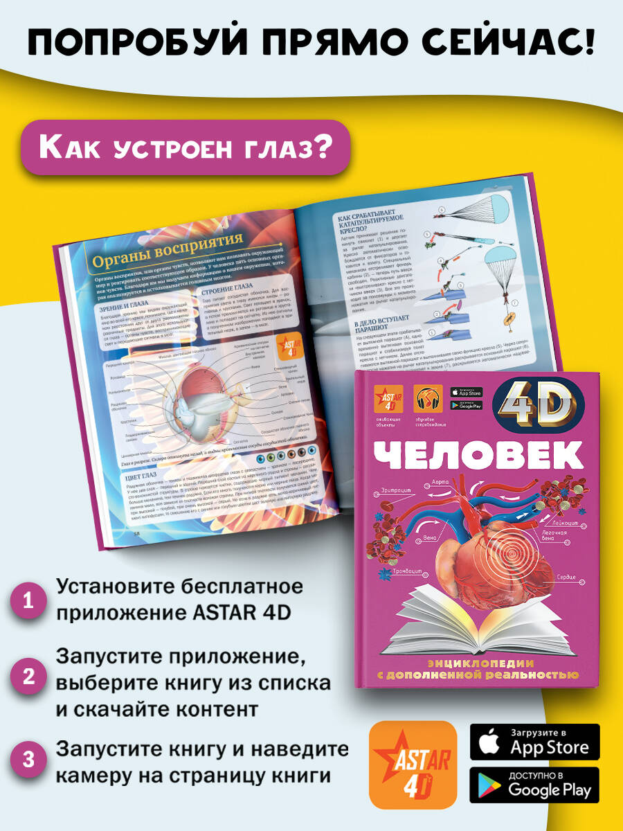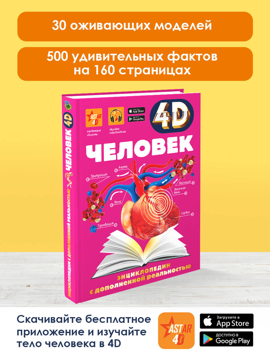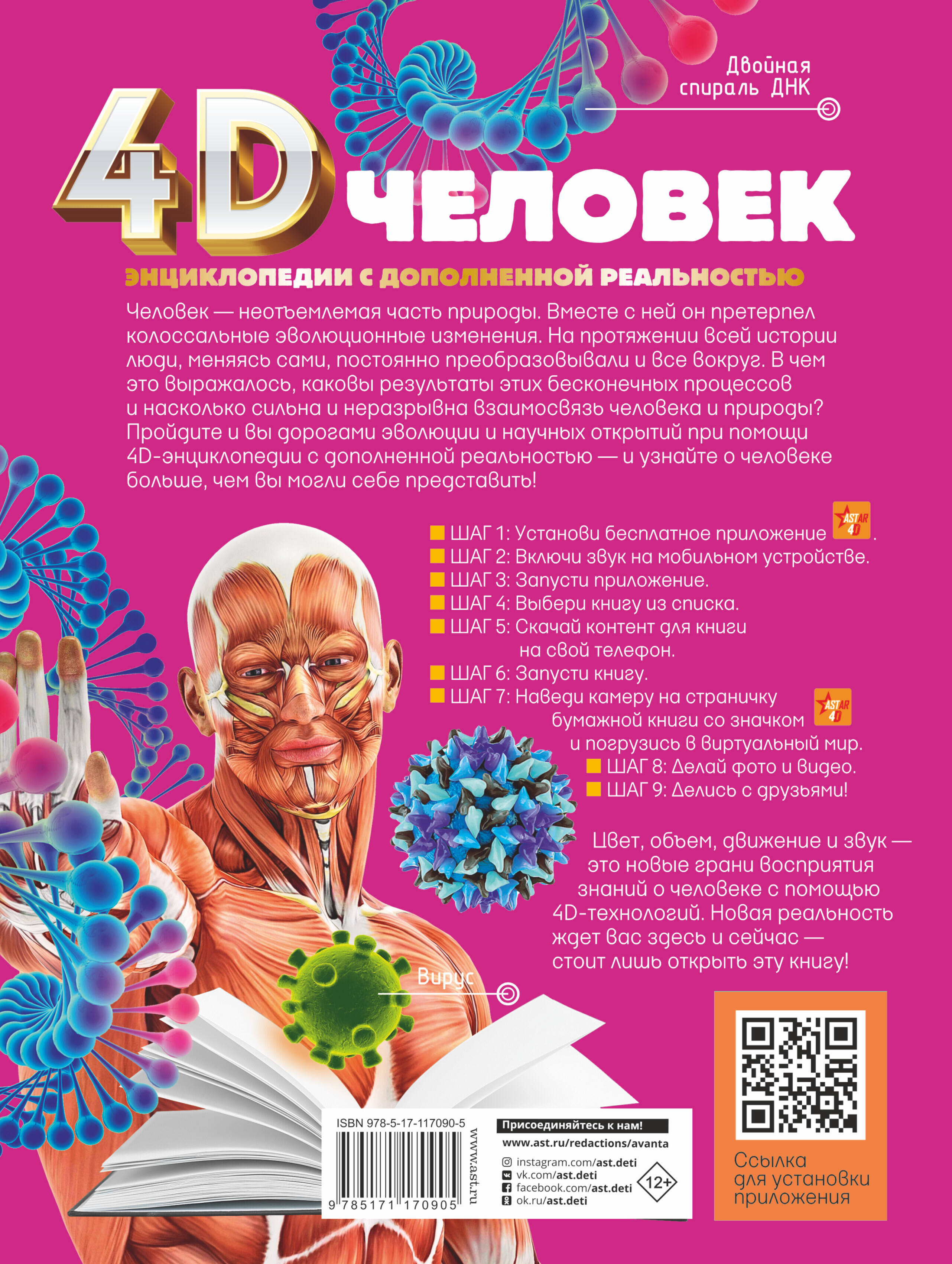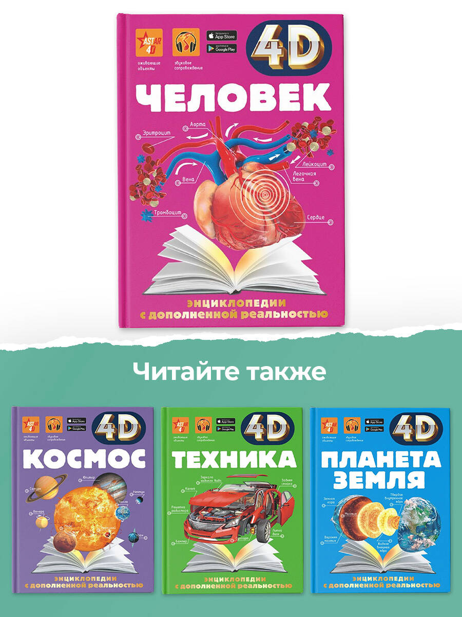 Эта 4D-энциклопедия с дополненной реальностью расскажет обо всех этапах становления человека - начиная с возникновения Вселенной и заканчивая той самой минутой, когда вы читаете эту книгу. Зарождение живых организмов и их эволюция, развитие первобытного человека и анатомия современного, механизмы наследственности и сила иммунитета, эмоции и чувства людей и бесстрастность роботов - все это вы найдете на страницах данного издания. А "живые" иллюстрации покажут, как функционирует сердце и где находится печень, заставят австралопитека помахать вам рукой из прошлого, а робота - исследовать космос, познакомят с самыми маленькими нашими "врагами" - вирусами и бактериями. Каждую анимацию дополняет познавательная звукозапись. Откройте эту необычную энциклопедию и узнайте больше о себе и мире, частью которого является каждый из нас.| Издательство | ИЗДАТЕЛЬСТВО "АСТ" |