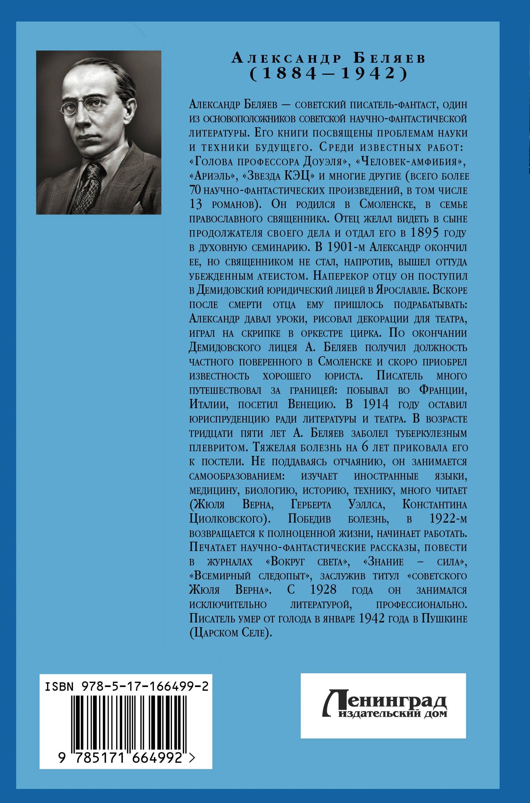 Александр Беляев (1884-1942) - один из основоположни- ков жанра научной фантастики в нашей стране. Прикованный к постели, писатель жил в изумительном мире, созданном его воображением. Силой своей фантазии он рисовал будущее, предвосхищая возможность дальнейших открытий и новых достижений. В сборник входят лучшие романы писателя "Голова про- фессора Доуэля", "Человек-амфибия" и "Остров Погибших Кораблей".