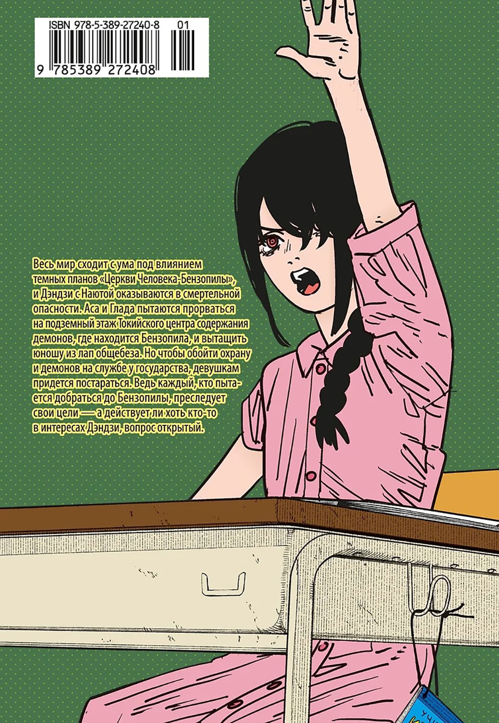 Весь мир сходит с ума под влиянием темных планов «Церкви Человека-Бензопилы», и Дэндзи с Наютой оказываются в смертельной опасности. Аса и Глада пытаются прорваться на подземный этаж Токийского центра содержания демонов, где находится Бензопила, и вытащить юношу из лап общебеза. Но, чтобы обойти охрану и демонов на службе у государства, девушкам придется постараться. Ведь каждый, кто пытается добраться до Бензопилы, предследует свои цели - а действует ли хоть кто-то в интересах Дэндзи, вопрос открытый.| Издательство | Азбука |
