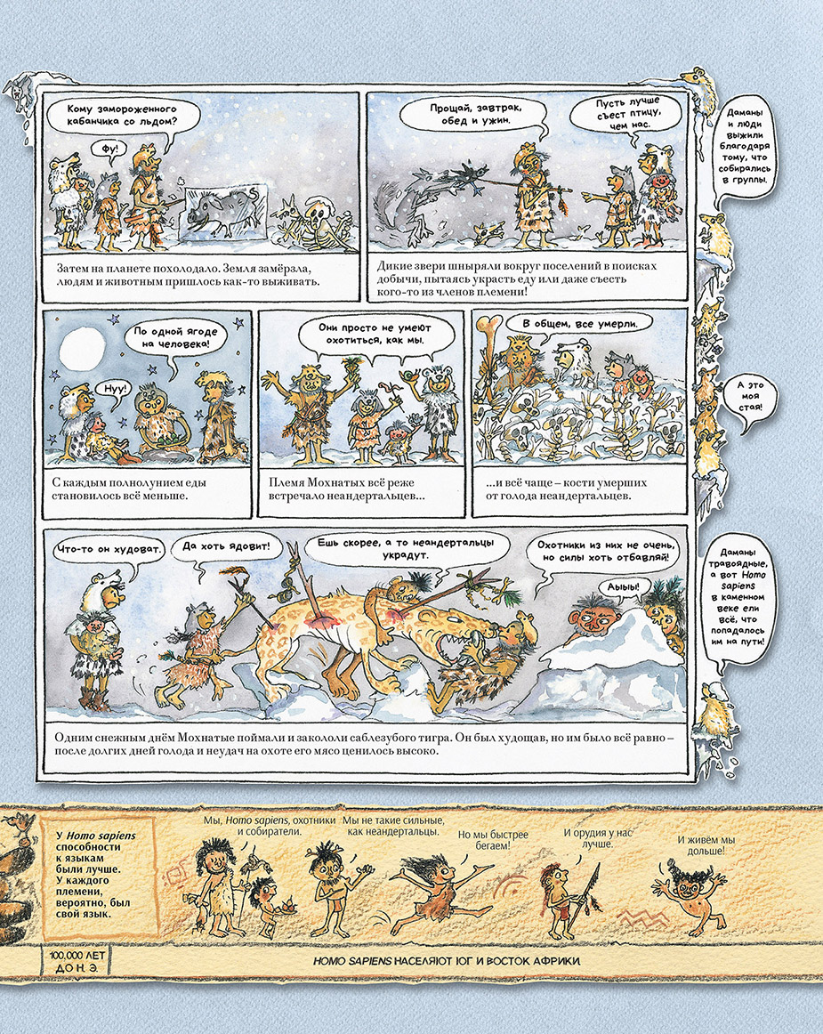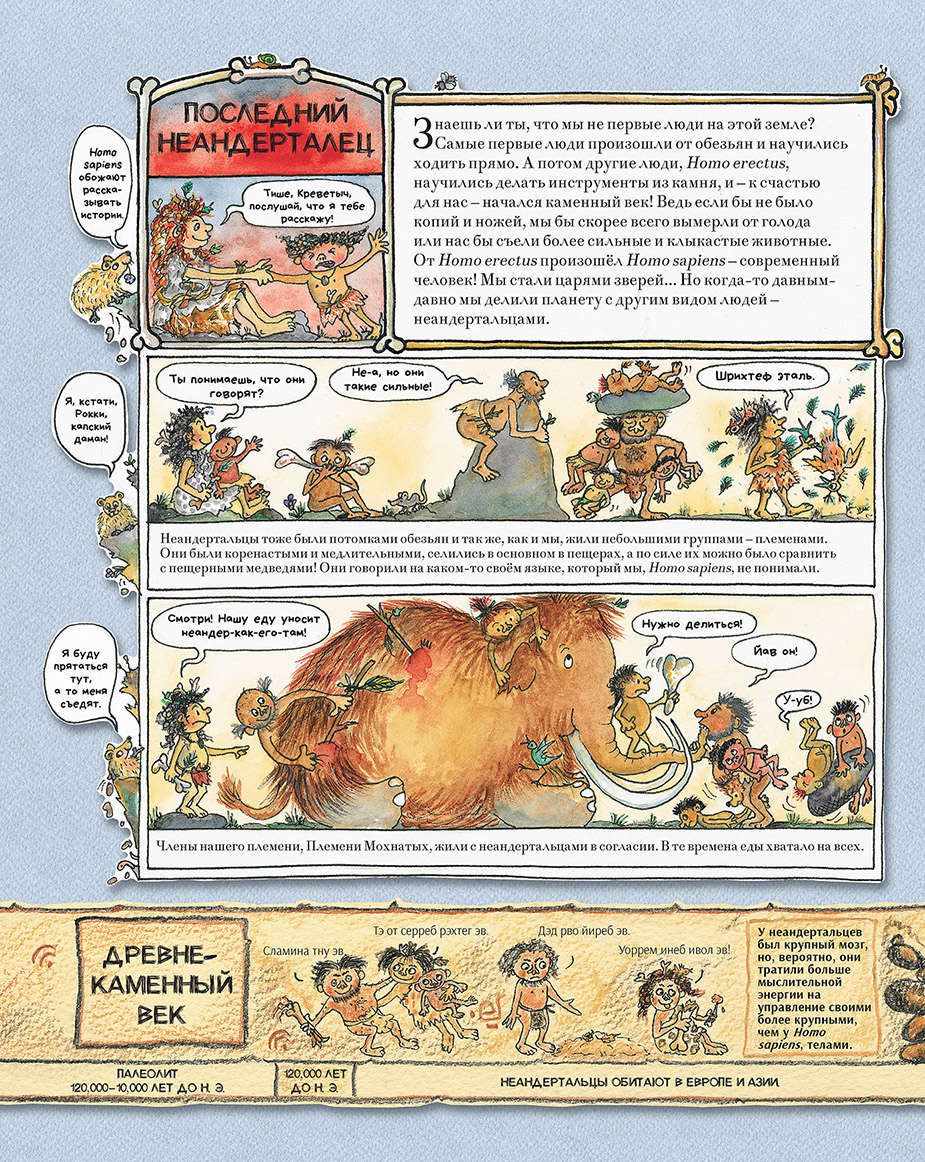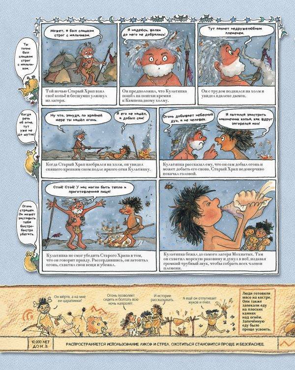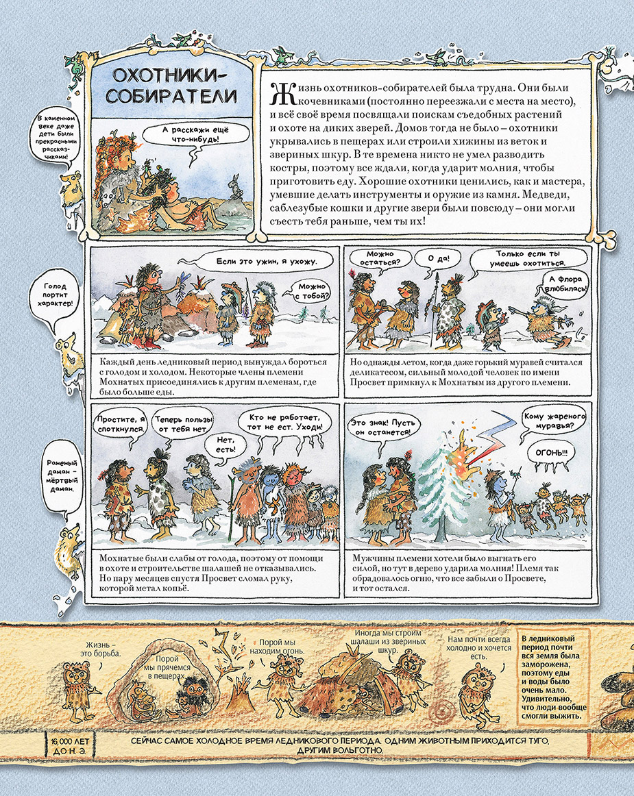 В этой книге читателей ждёт настоящее доисторическое приключение - знакомство с первыми людьми на Земле, из племени Мохнатых. Вы узнаете, как Мохнатые выживали во времена ледникового периода, как впервые добыли огонь, как из кочевников превратились в земледельцев и одомашнили диких животных. Занимательные факты, шутки и любимый детский формат - комиксы - делают эту книгу великолепным пособием по истории человечества.