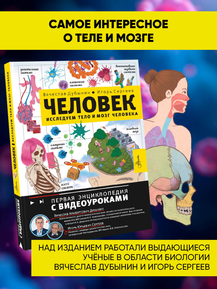 Книга замечательных ученых и популяризаторов науки Вячеслава Дубынина и Игоря Сергеева расскажет юному читателю о самом интересном на свете - о человеке. Изучать тело и мозг человека школьникам помогут и лекции Вячеслава Дубынина, ссылки на которые в виде QR-кодов представлены в книге. Для среднего и старшего школьного возраста.| Издательство | Издательство "АСТ" |