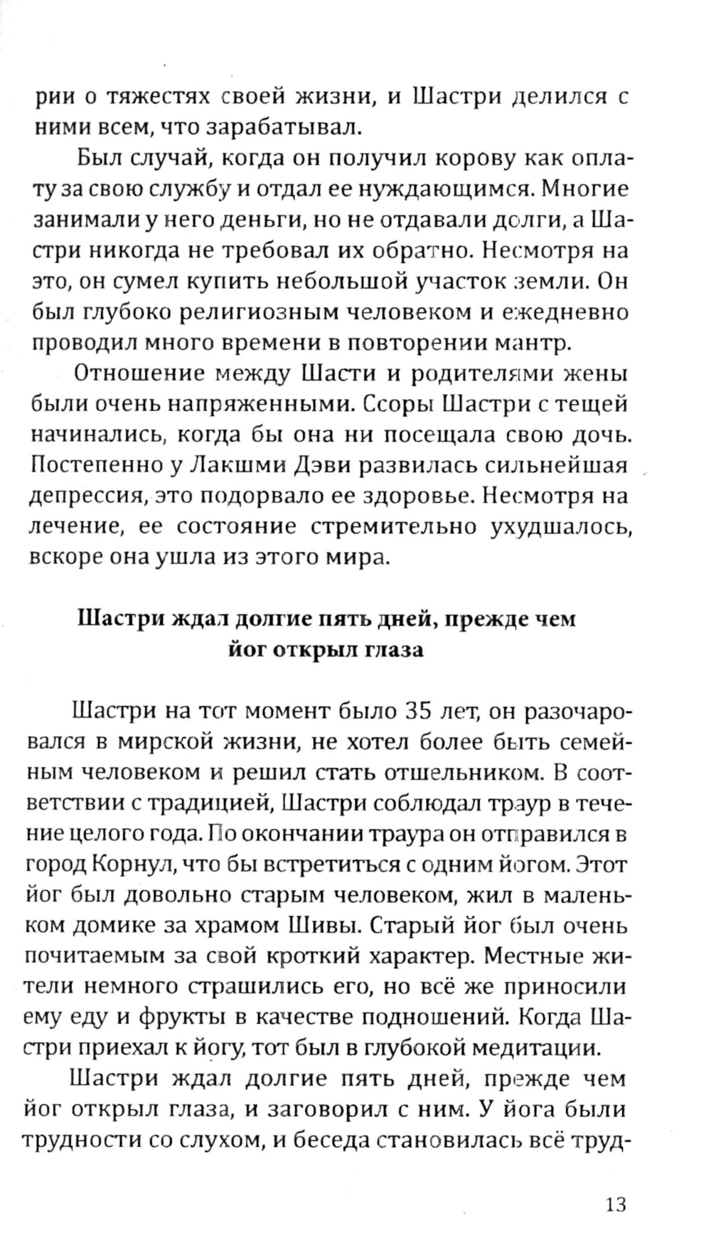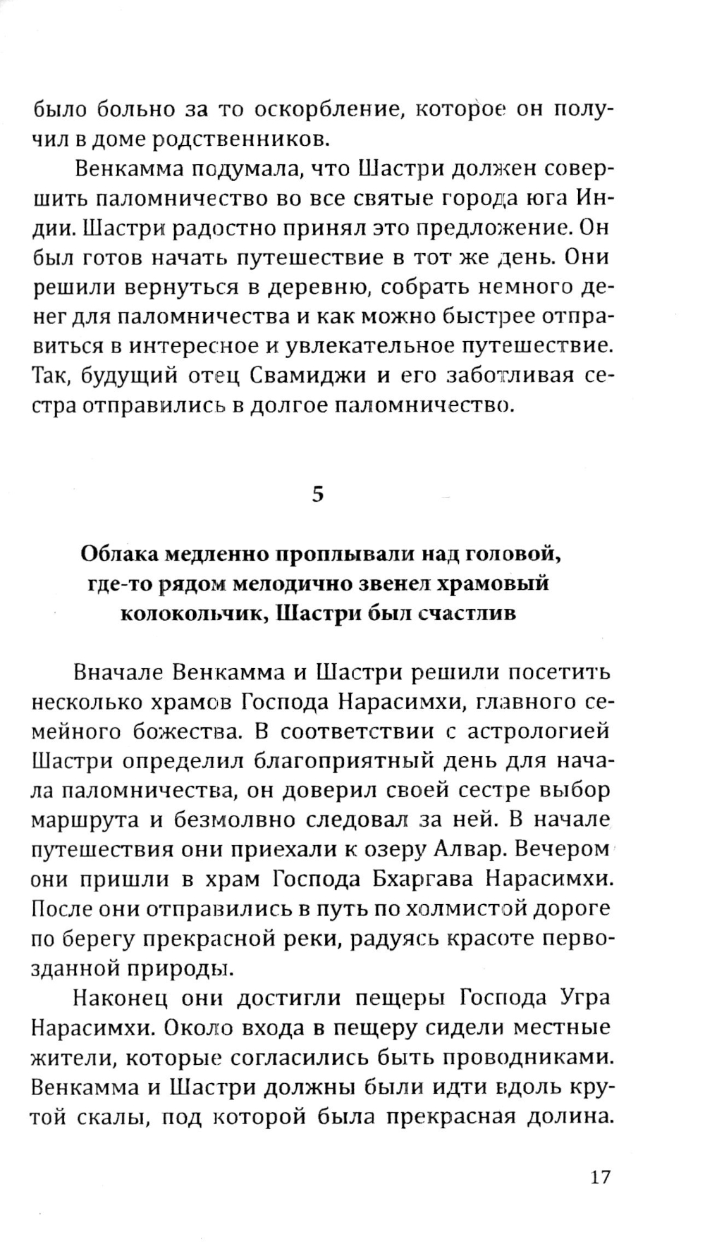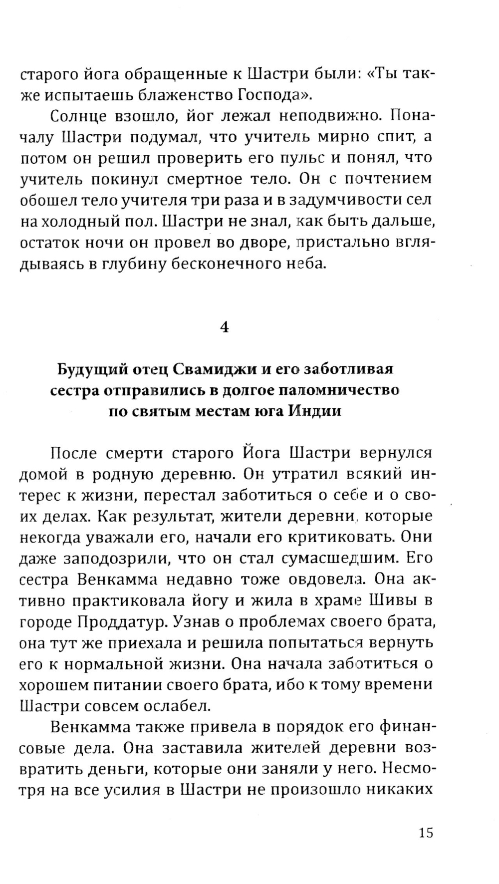 Свами Ганапати Саччидананда - известный гуру. Многие в Индии считают его воплощением Божества Даттатреи. Он обладает исключительной харизмой и огромной духовной силой. Кроме того, является одним из наиболее авторитетных мастеров в тантрической системе Шривидья - древнейшем культе Богини Матери. Практики Шривидья помогают пробудить внутреннюю силу йога (Кундалини-шакти) и достичь высшей духовной реализации. Однако эти практики традиционно считаются тайными, поэтому большинство гуру предпочитают держать все тонкости этой системы в секрете. Свами Ганапати Саччидананда является одним из истинных носителей древней традиции йоги и медитации. Изучая жизненный путь Ганапати Свами, мы извлекаем различные уроки, которые могут быть чрезвычайно полезны для каждого духовного искателя.| Издательство | Амрита-Русь |
