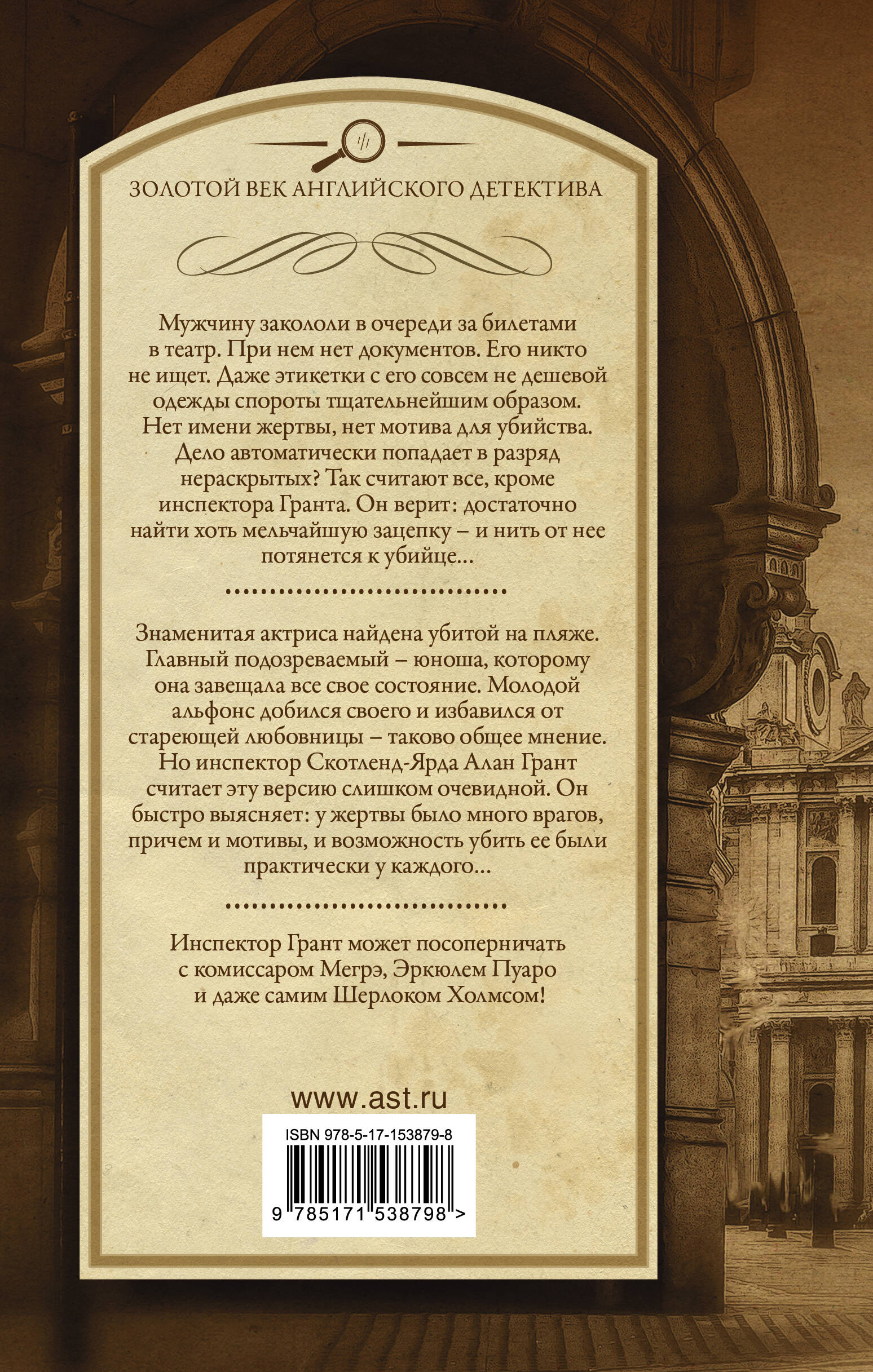 Мужчину закололи в очереди за билетами в театр. При нем нет документов. Его никто не ищет. Даже этикетки с его совсем не дешевой одежды спороты тщательнейшим образом. Нет имени жертвы, нет и мотива для убийства. Дело автоматически попадает в разряд нераскрытых? Так считают все, кроме инспектора Гранта. Он верит: достаточно найти хоть мельчайшую зацепку - и нить от нее потянется к убийце… Знаменитая актриса найдена убитой на пляже. Главный подозреваемый - юноша, которому она завещала все свое состояние. Молодой альфонс добился своего и избавился от стареющей любовницы - таково общее мнение. Но инспектор Скотленд-Ярда Алан Грант считает эту версию слишком очевидной. Он быстро выясняет: у жертвы было много врагов, причем и мотивы, и возможность убить ее были практически у каждого…| Издательство | ИЗДАТЕЛЬСТВО "АСТ" |