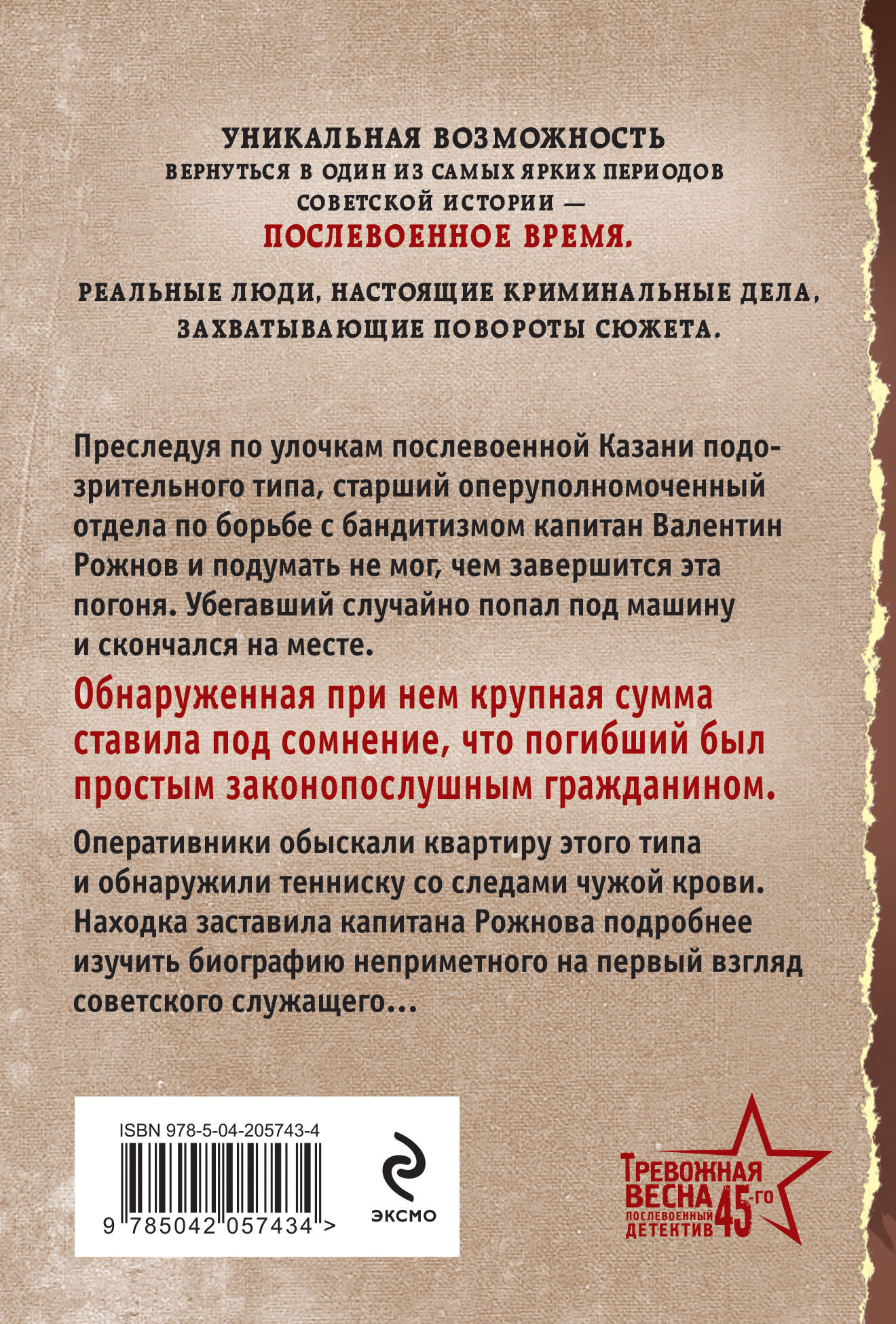 Преследуя по улочкам послевоенной Казани подозрительного типа, старший оперуполномоченный отдела по борьбе с бандитизмом капитан Валентин Рожнов и подумать не мог, чем завершится эта погоня. Убегавший случайно попал под машину и скончался на месте. Обнаруженная при нем крупная сумма ставила под сомнение, что погибший был простым законопослушным гражданином. Оперативники обыскали квартиру этого типа и обнаружили тенниску со следами чужой крови. Находка заставила капитана Рожнова подробнее изучить биографию неприметного, на первый взгляд, советского служащего… Уникальная возможность вернуться в один из самых ярких периодов советской истории - в послевоенное время. Реальные люди, настоящие криминальные дела, захватывающие повороты сюжета. Персонажи, похожие на культовые образы фильма «Место встречи изменить нельзя». Дух времени, трепетно хранящийся во многих семьях. Необычно и реалистично показанная «кухня» повседневной работы советской милиции.| Издательство | ООО "Издательство "Эксмо" |