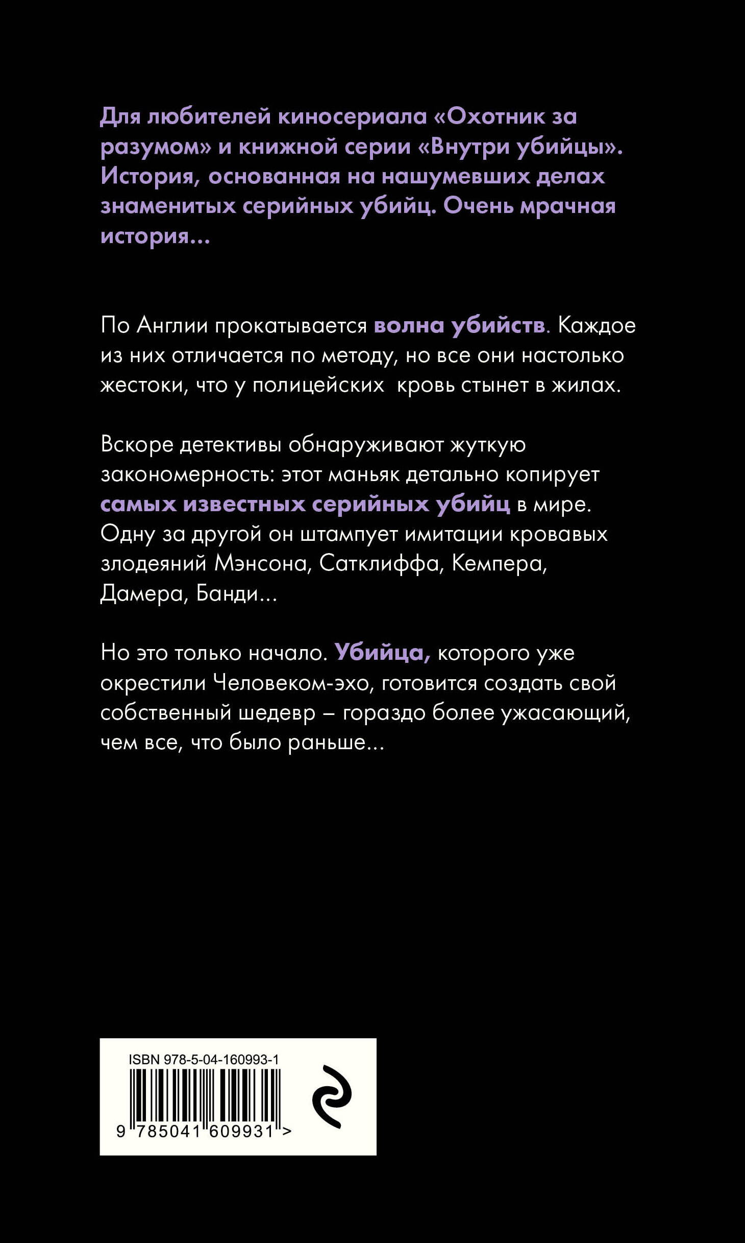 Он копирует самых жутких убийц мира. Но скоро превзойдет их всех… Для любителей киносериала «Охотник за разумом» и книжной серии «Внутри убийцы». История, основанная на нашумевших делах знаменитых серийных убийц. Очень мрачная история… По Англии прокатывается волна убийств. Каждое из них различается по методам, но все они настолько жестоки, что у полицейских буквально кровь стынет в жилах. Вскоре детективы обнаруживают жуткую закономерность: этот маньяк детально копирует самых известных серийных убийц в мире. Одну за другой он штампует имитации кровавых злодеяний Мэнсона, Сатклиффа, Кемпера, Дамера, Банди… Но это только начало. Убийца, которого уже окрестили Человеком-эхо, готовится создать свой собственный шедевр - гораздо более ужасающий, чем все, что было раньше… «Этот роман вызывает тот самый классический страх с привкусом крови во рту; он - своего рода зверь, хитрый, мускулистый и опасный; новый смертоносный хищник в заманчиво олдскульной шкуре». - А. Дж. Финн «Я буквально проглотила эту книгу. Такая мрачная… автор явно знает толк в серийных убийцах. Не для слабонервных - но гениально». - Кэтрин Купер «Очень графично - и жутко. Настоящая кровавая баня!» - Виктория Селман «Меня просто вынесло. Абсолютно классная вещь!» - Джеймс Деларджи| Издательство | ООО "Издательство "Эксмо" |