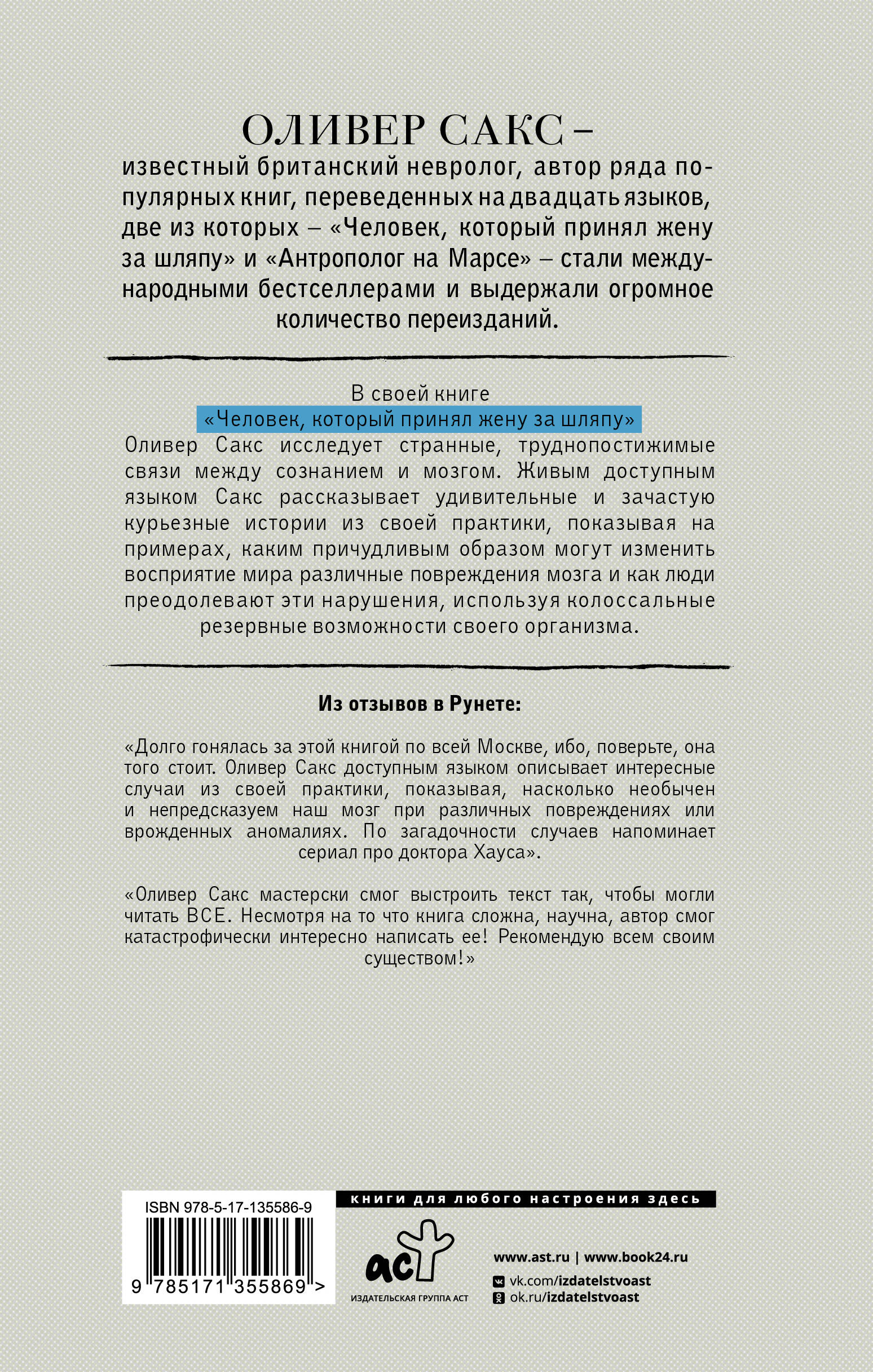 Оливер Сакс - известный британский невролог, автор ряда популярных книг, переведенных на двадцать языков, две из которых - "Человек, который принял жену за шляпу" и "Антрополог на Марсе" - стали международными бестселлерами и выдержали огромное количество переизданий. В своей книге "Человек, который принял жену за шляпу" Оливер Сакс исследует странные, труднопостижимые связи между сознанием и мозгом. Живым доступным языком Сакс рассказывает удивительные и зачастую курьезные истории из своей практики, показывая на примерах, каким причудливым образом могут изменить восприятие мира различные повреждения мозга и как люди преодолевают эти нарушения, используя колоссальные резервные возможности своего организма.| Издательство | ИЗДАТЕЛЬСТВО "АСТ" |