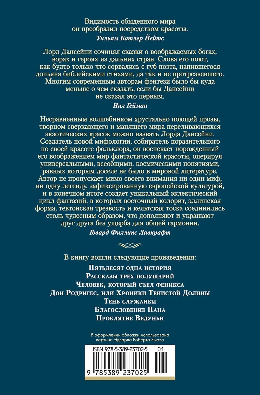 Эдвард Джон Мортон Дракс Планкетт, 18-й барон Дансейни, публиковавшийся как лорд Дансейни, - знаменитый автор множества романов, пьес и литературных сказок, стоявший у истоков самого жанра фэнтези. Едва ли не первым в европейской литературе он создал целый «вторичный мир» - со своей космологией, мифологией, историей и географией. Его мифология повлияла на Лавкрафта, Толкина и Борхеса, а парадоксальный юмор, постоянная игра с читательскими ожиданиями - на Нила Геймана и на всю современную ироническую фэнтези. В данной книге вашему вниманию предлагаются три сборника мастера - «Пятьдесят одна история», «Рассказы трех полушарий», «Человек, который съел феникса», - а также четыре романа: дилогия «Хроники Тенистой Долины» («Дон Родригес, или Хроники Тенистой Долины», «Тень служанки»), «Благословение Пана», «Проклятие Ведуньи». Здесь ирландский юноша, съевший бессмертного феникса, начинает видеть волшебную изнанку мира, тихая деревня в английской глубинке поддается чарам древнего бога Пана, а потомственная ведьма насылает проклятие на торфоперерабатывающий синдикат... Часть произведений публикуется на русском впервые или в новых переводах, остальные - в новой редакции. Издание сопровождается иллюстрациями знаменитого художника-сказочника Сидни Сайма, сделанными для первых публикаций книг Дансейни.| Издательство | Азбука |