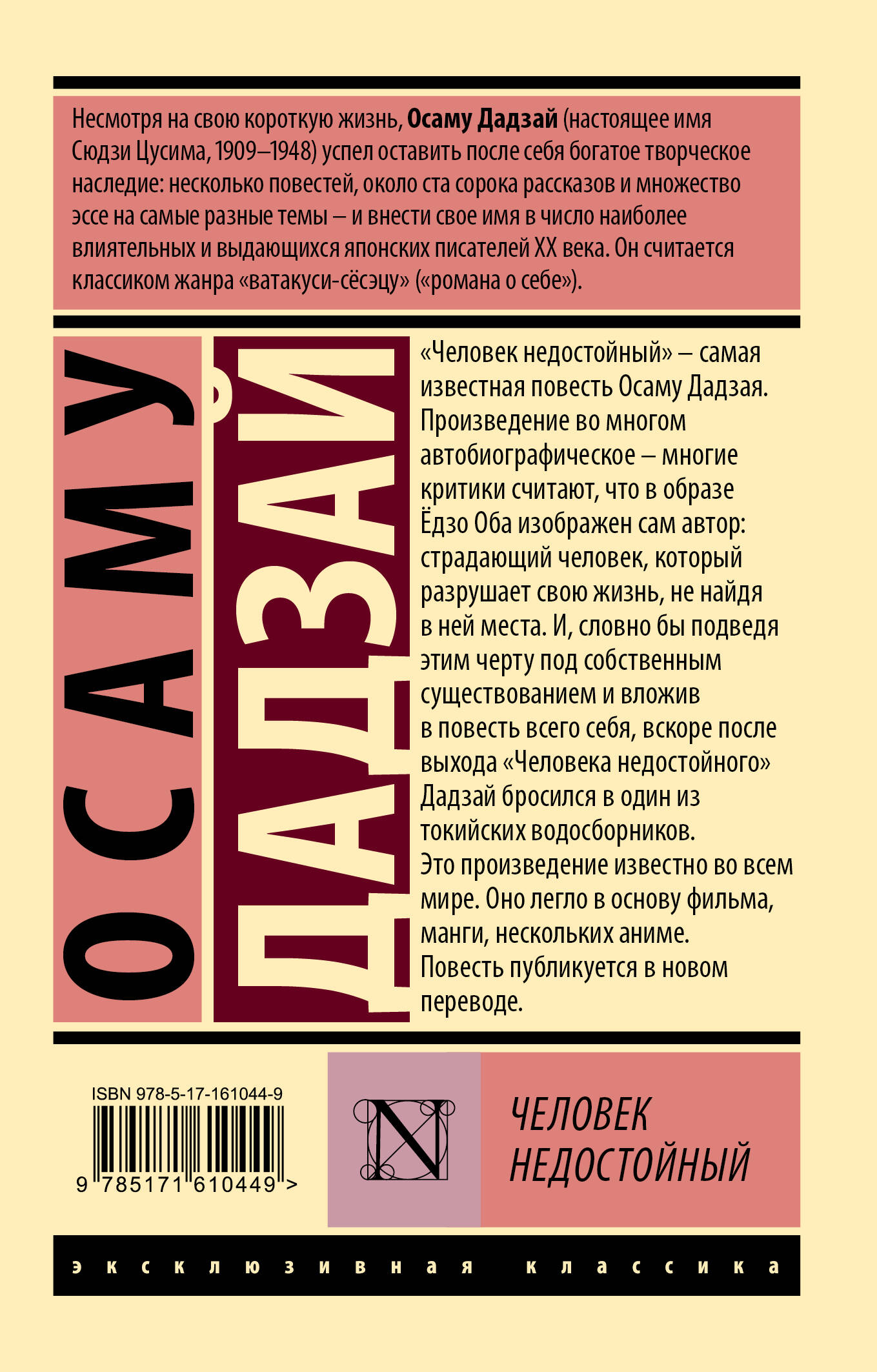 "Человек недостойный" - самая известная повесть Осаму Дадзая. Произведение во многом автобиографическое - многие критики считают, что в образе Ёдзо Оба изображен сам автор: страдающий человек, который разрушает свою жизнь, не найдя в ней места. И, словно бы подведя этим черту под собственным существованием и вложив в повесть всего себя, вскоре после выхода "Человека недостойного" Дадзай бросился в один из токийских водосборников. Это произведение известно во всем мире. Оно легло в основу фильма, манги, нескольких аниме. Повесть публикуется в новом переводе.| Издательство | Издательство "АСТ" |
