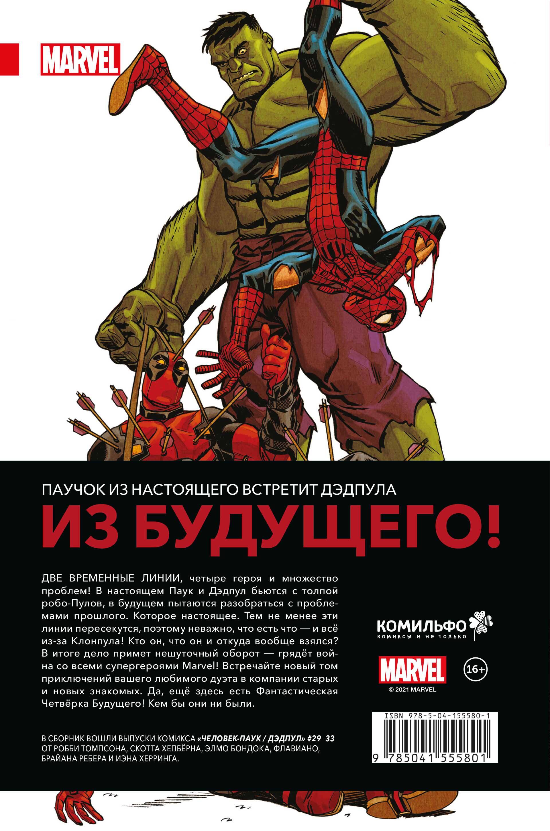Паучок из настоящего встретит Дэдпула из будущего! ДВЕ ВРЕМЕННЫЕ ЛИНИИ, четыре героя и множество проблем! В настоящем Паук и Дэдпул бьются с толпой робо-Пулов, в будущем пытаются разобраться с проблемами прошлого. Которое настоящее. Тем не менее эти линии пересекутся, поэтому неважно, что есть что - и всё из-за Клонпула! Кто он, что он и откуда вообще взялся? В итоге дело примет нешуточный оборот - грядёт война со всеми супергероями Marvel! Встречайте новый том приключений вашего любимого дуэта в компании старых и новых знакомых. Да, ещё здесь есть Фантастическая Четвёрка Будущего! Кем бы они ни были. В сборник вошли выпуски комикса «Человек-паук / Дэдпул» #29-33 от Робби Томпсона, Скотта Хепбёрна, Элмо Бондока, Флавиано, Брайана Ребера и Иэна Херринга.| Издательство | Эксмо |
