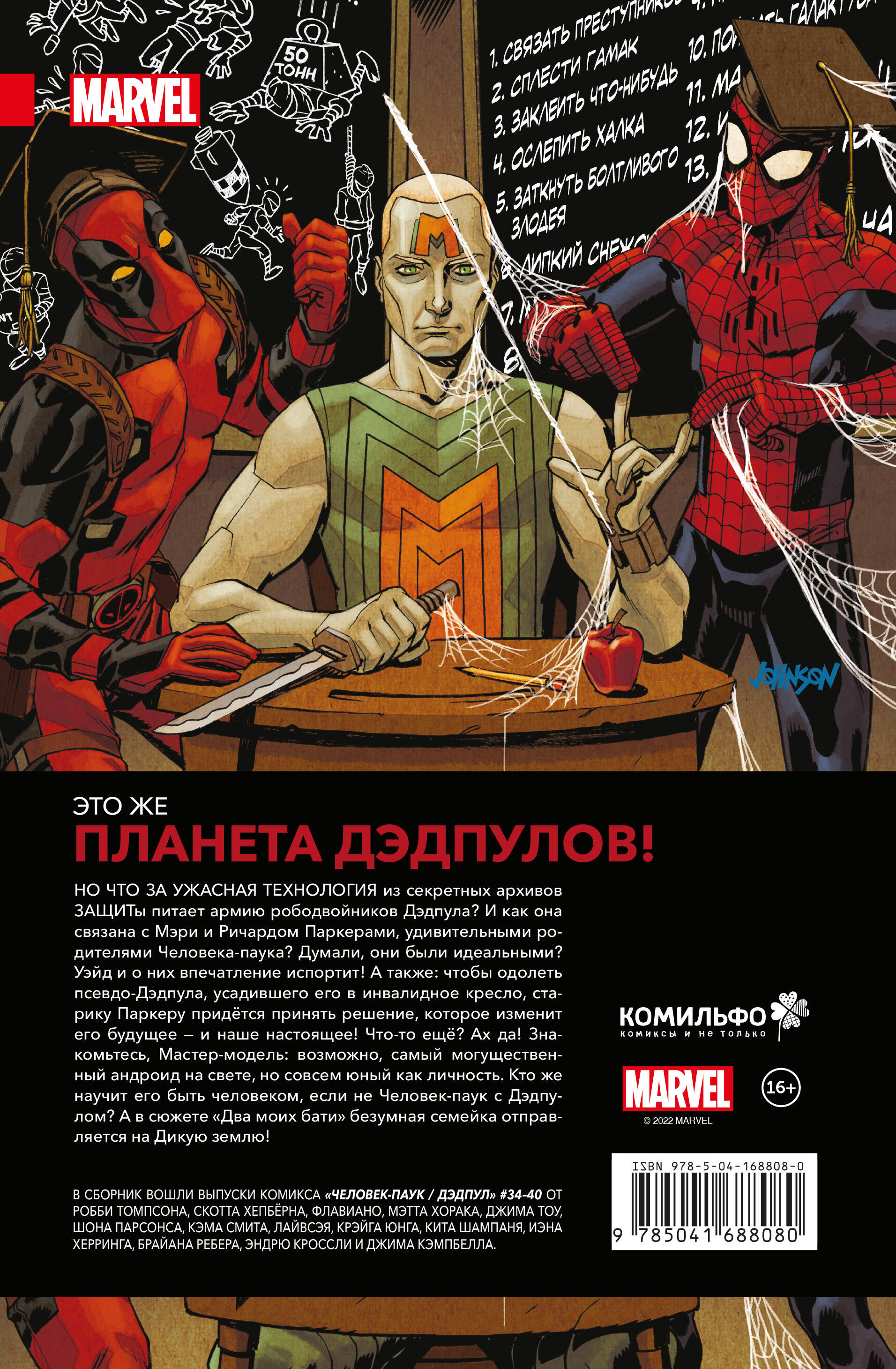 Это же планета Дэдпулов! Но что за ужасная технология из секретных архивов ЗАЩИТы питает армию рободвойников Дэдпула? И как она связана с Мэри и Ричардом Паркерами, удивительными родителями Человека-паука? Думали, они были идеальными? Уэйд и о них впечатление испортит! А также: чтобы одолеть псевдо-Дэдпула, усадившего его в инвалидное кресло, старику Паркеру придётся принять решение, которое изменит его будущее - и наше настоящее! Что-то ещё? Ах да! Знакомьтесь, Мастер-модель: возможно, самый могущественный андроид на свете, но совсем юный как личность. Кто же научит его быть человеком, если не Человек-паук с Дэдпулом? А в сюжете «Два моих бати» безумная семейка отправляется на Дикую землю! В сборник вошли выпуски комикса «Человек-паук / Дэдпул» #34-40 от Робби Томпсона, Скотта Хепбёрна, Флавиано, Мэтта Хорака, Джима Тоу, Шона Парсонса, Кэма Смита, Лайвсэя, Крэйга Юнга, Кита Шампаня, Иэна Херринга, Брайана Ребера, Эндрю Кроссли и Джима Кэмпбелла.| Издательство | ООО "Издательство "Эксмо" |