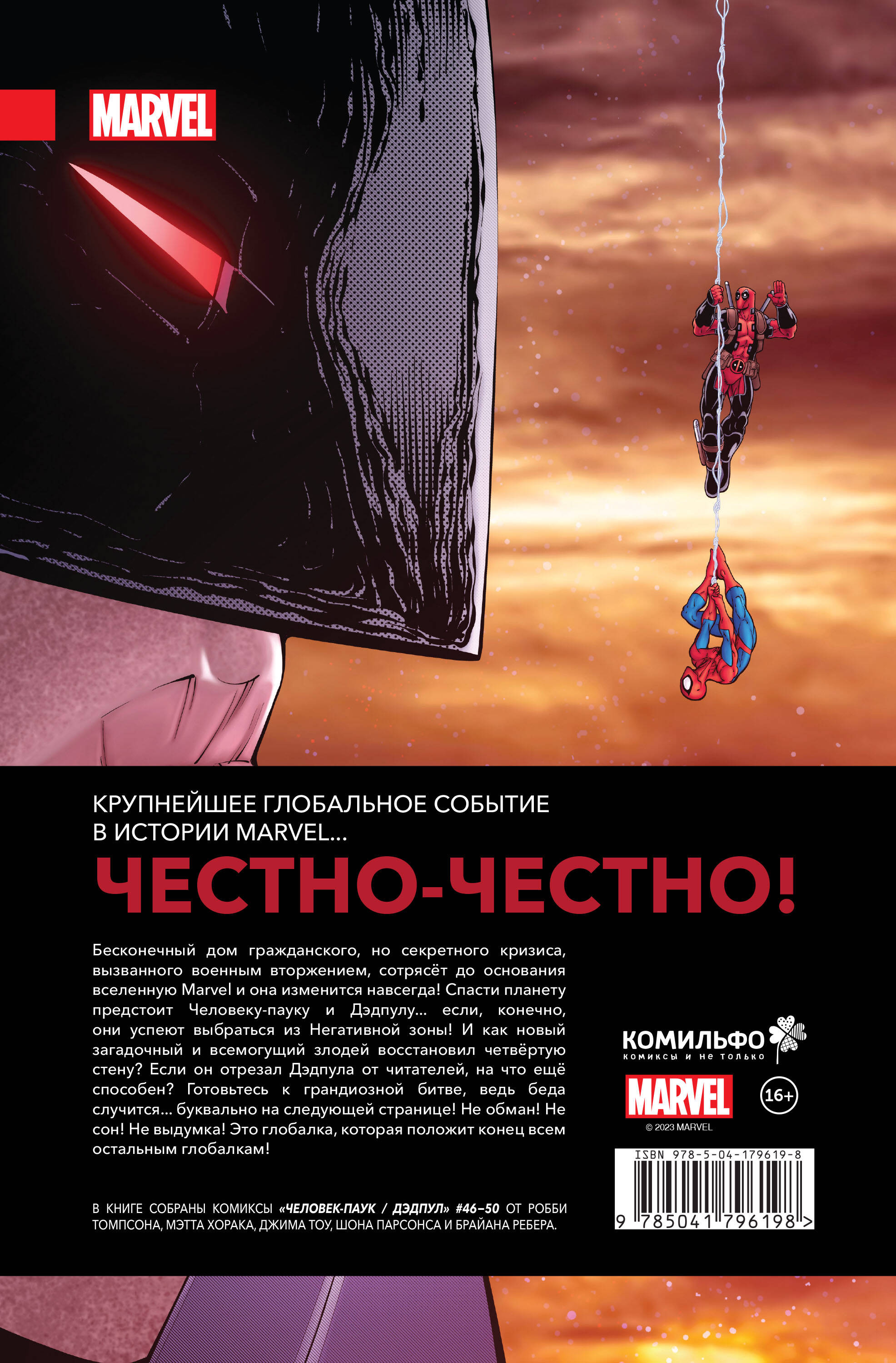 Крупнейшее глобальное событие в истории Marvel... Честно-честно! Бесконечный дом гражданского, но секретного кризиса, вызванного военным вторжением, сотрясёт до основания вселенную Marvel и она изменится навсегда! Спасти планету предстоит Человеку-пауку и Дэдпулу... Если, конечно, они успеют выбраться из Негативной зоны! И как новый загадочный и всемогущий злодей восстановил четвёртую стену? Если он отрезал Дэдпула от читателей, на что ещё способен? Готовьтесь к грандиозной битве, ведь беда случится... Буквально на следующей странице! Не обман! Не сон! Не выдумка! Это глобалка, которая положит конец всем остальным глобалкам! В книге собраны комиксы «Человек-паук / Дэдпул» #46−;50 от Робби Томпсона, Мэтта Хорака, Джима Тоу, Шона Парсонса и Брайана Ребера.