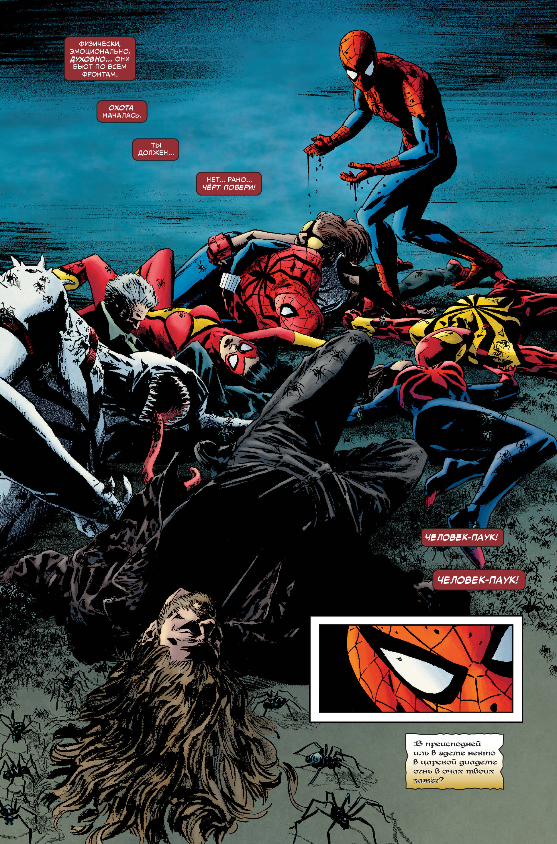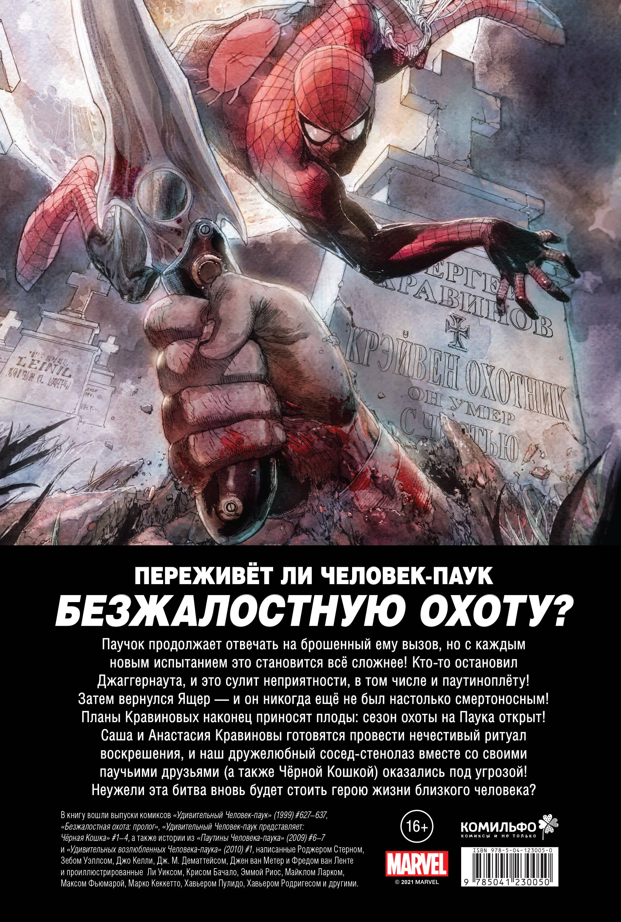 Переживёт ли человек-паук безжалостную охоту? Паучок продолжает отвечать на брошенный ему вызов, но с каждым новым испытанием это становится всё сложнее! Кто-то остановил Джаггернаута, и это сулит неприятности, в том числе и паутиноплёту! Затем вернулся Ящер - и он никогда ещё не был настолько смертоносным! Планы Кравиновых наконец приносят плоды: сезон охоты на Паука открыт! Саша и Анастасия Кравиновы готовятся провести нечестивый ритуал воскрешения, и наш дружелюбный сосед-стенолаз вместе со своими паучьими друзьями (а также Чёрной Кошкой) оказались под угрозой! Неужели эта битва вновь будет стоить герою жизни близкого человека? В книгу вошли выпуски комиксов «Удивительный Человек-паук» (1999) #627-637, «Безжалостная охота: пролог», «Удивительный Человек-паук представляет: Чёрная Кошка» #1-4, а также истории из «Паутины Человека-паука» (2009) #6-7 и «Удивительных возлюбленных Человека-паука» (2010) #1, написанные Роджером Стерном, Зебом Уэллсом, Джо Келли, Дж. М. Дематтейсом, Джен ван Метер и Фредом ван Ленте и проиллюстрированные Ли Уиксом, Крисом Бачало, Эммой Риос, Майклом Ларком, Максом Фьюмарой, Марко Кеккетто, Хавьером Пулидо, Хавьером Родригесом и другими.