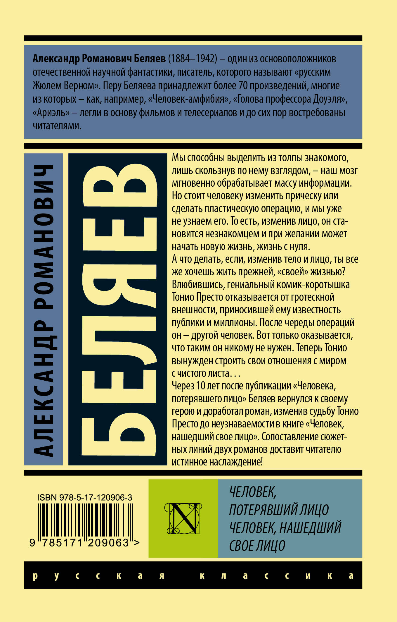 "Человек, потерявший лицо" Мы способны выделить из толпы знакомого, лишь скользнув по нему взглядом, - наш мозг мгновенно обрабатывает массу информации. Но стоит человеку изменить прическу или сделать пластическую операцию, и мы уже не узнаем его. То есть, изменив лицо, он становится незнакомцем и при желании может начать новую жизнь, жизнь с нуля. А что делать, если, изменив тело и лицо, ты все же хочешь жить прежней, "своей" жизнью? Влюбившись, гениальный комик-коротышка Тонио Престо отказывается от гротескной внешности, приносившей ему известность публики и миллионы. После череды операций он - другой человек. Вот только оказывается, что таким он никому не нужен. Теперь Тонио вынужден строить свои отношения с миром с чистого листа… Через 10 лет после публикации "Человека, потерявшего лицо" Беляев вернулся к своему герою и доработал роман, изменив судьбу Тонио Престо до неузнаваемости в книге "Человек, нашедший свое лицо". Сопоставление сюжетных линий двух романов доставит читателю истинное наслаждение!| Издательство | ИЗДАТЕЛЬСТВО "АСТ" |