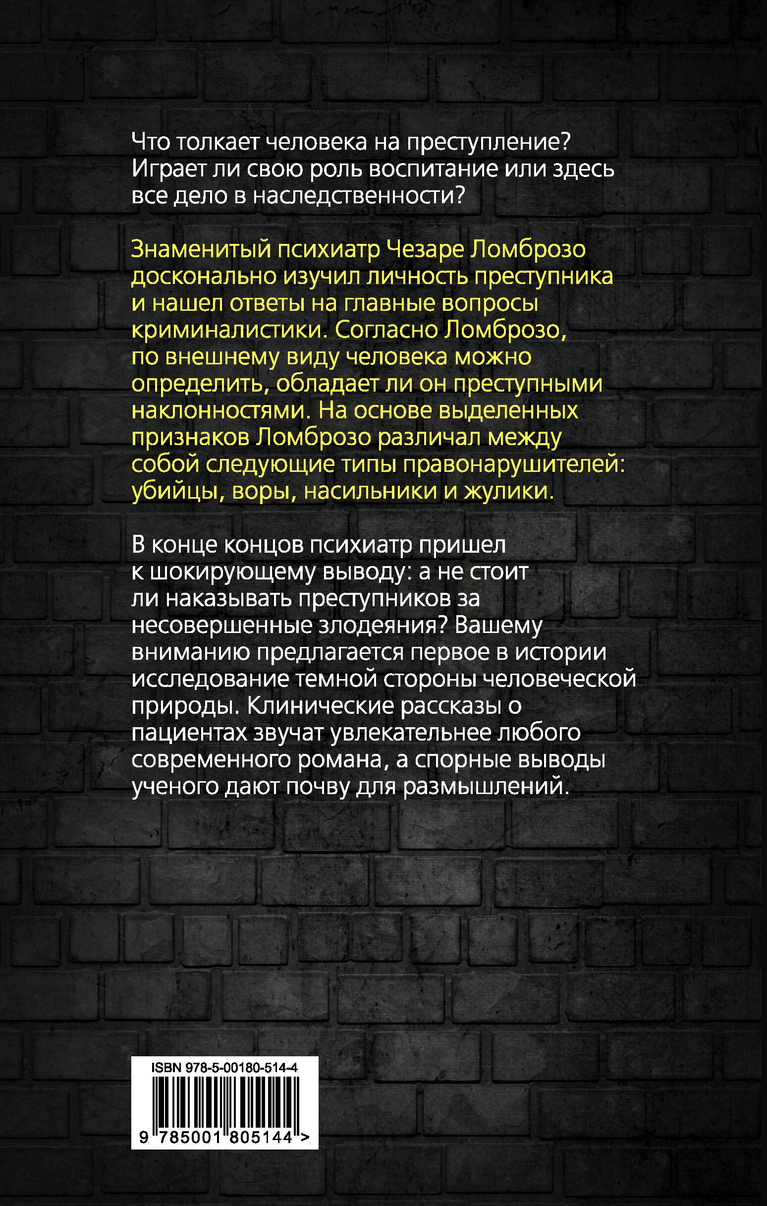 Что толкает человека на преступление? Играет ли свою роль воспитание или здесь все дело в наследственности? Знаменитый психиатр Чезаре Ломброзо досконально изучил личность преступника и нашел ответы на главные вопросы криминалистики. Согласно Ломброзо, по внешнему виду человека можно определить, обладает ли он преступными наклонностями. На основе выделенных признаков Ломброзо различал между собой следующие типы правонарушителей: убийцы, воры, насильники и жулики. В конце концов, психиатр пришел к шокирующему выводу: а не стоит ли наказывать преступников за несовершенные злодеяния? Вашему вниманию предлагается первое в истории исследование темной стороны человеческой природы. Клинические рассказы о пациентах звучат увлекательнее любого современного романа, а спорные выводы ученого дают почву для размышлений.| Издательство | Родина Издательство ООО |
