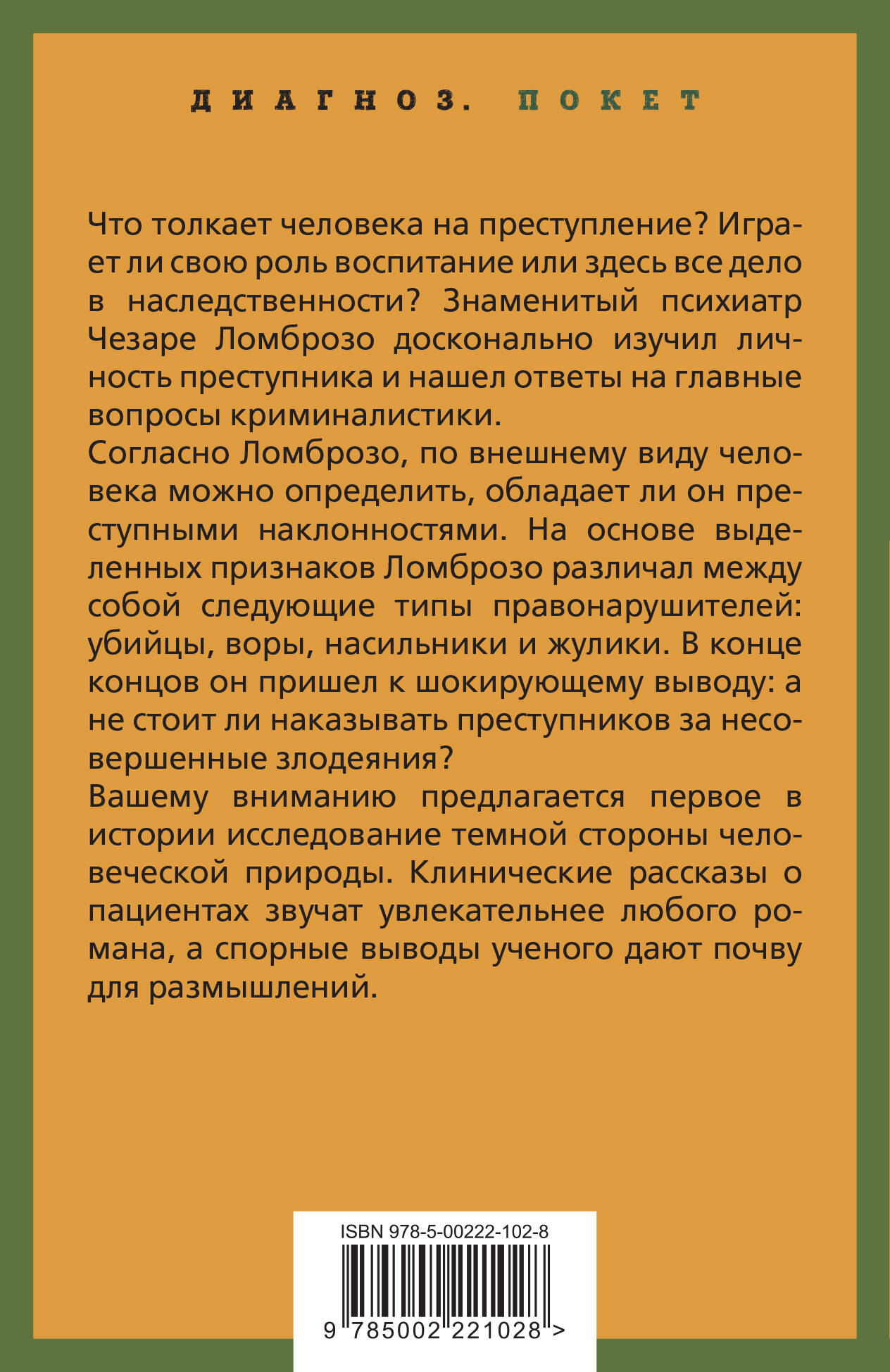 Что толкает человека на преступление? Играет ли свою роль воспитание или здесь все дело в наследственности? Знаменитый психиатр Чезаре Ломброзо досконально изучил личность преступника и нашел ответы на главные вопросы криминалистики. Согласно Ломброзо, по внешнему виду человека можно определить, обладает ли он преступными наклонностями. На основе выделенных признаков Ломброзо различал между собой следующие типы правонарушителей: убийцы, воры, насильники и жулики. В конце концов, он пришел к шокирующему выводу: а не стоит ли наказывать преступников за несовершенные злодеяния? Вашему вниманию предлагается уникальное исследование темной стороны человеческой природы. Клинические рассказы о пациентах звучат увлекательнее любого романа, а смелые выводы ученого дают почву для размышлений.| Издательство | Родина Издательство ООО |