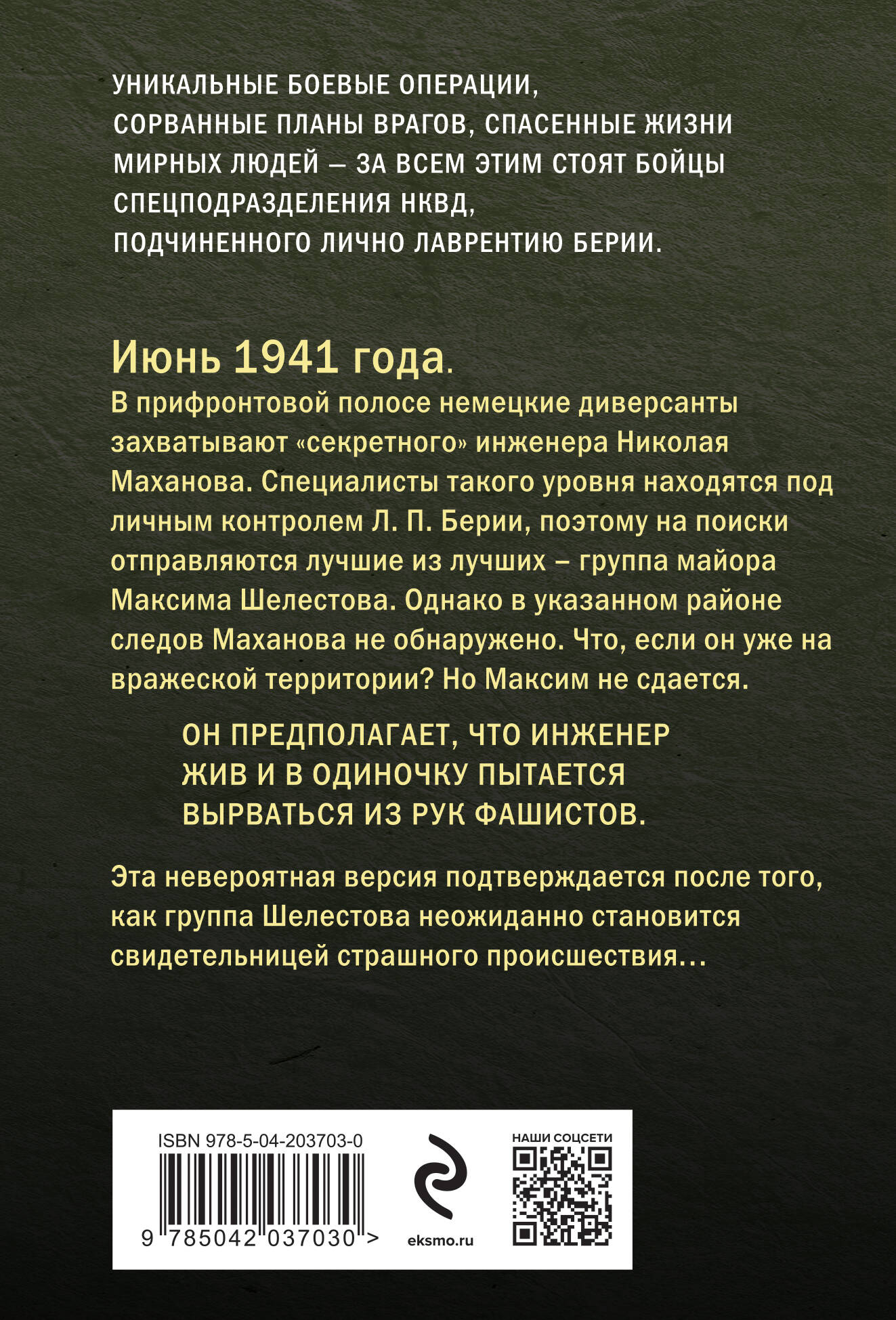 Роман о военном времени, о сложных судьбах и опасной работе неизвестных героев, вошедших в ударный состав «спецназа Берии». Июнь 1941 года. В прифронтовой полосе немецкие диверсанты захватывают «секретного» инженера Николая Маханова. Специалисты такого уровня находятся под личным контролем Л. П. Берии, поэтому на поиски отправляются лучшие из лучших - группа майора Максима Шелестова. Однако в указанном районе следов Маханова не обнаружено. Что, если он уже на вражеской территории? Но Максим не сдается. Он предполагает, что инженер жив и в одиночку пытается вырваться из рук фашистов. Эта невероятная версия подтверждается после того, как группа Шелестова неожиданно становится свидетельницей страшного происшествия… «Эта серия хороша тем, что в ней проведена верная главная мысль: в НКВД Лаврентия Берии умели верить людям, потому что им умел верить сам нарком. История группы майора Шелестова сходна с реальной историей крупного агента абвера, бывшего штабс-капитана царской армии Нелидова, попавшего на Лубянку в сентябре 1939 года. Тем более вероятными выглядят на фоне истории Нелидова приключения Максима Шелестова и его товарищей, описанные в этом романе». - С. Кремлев Общий тираж книг А. Тамоникова - более 10 миллионов экземпляров.| Издательство | ООО "Издательство "Эксмо" |