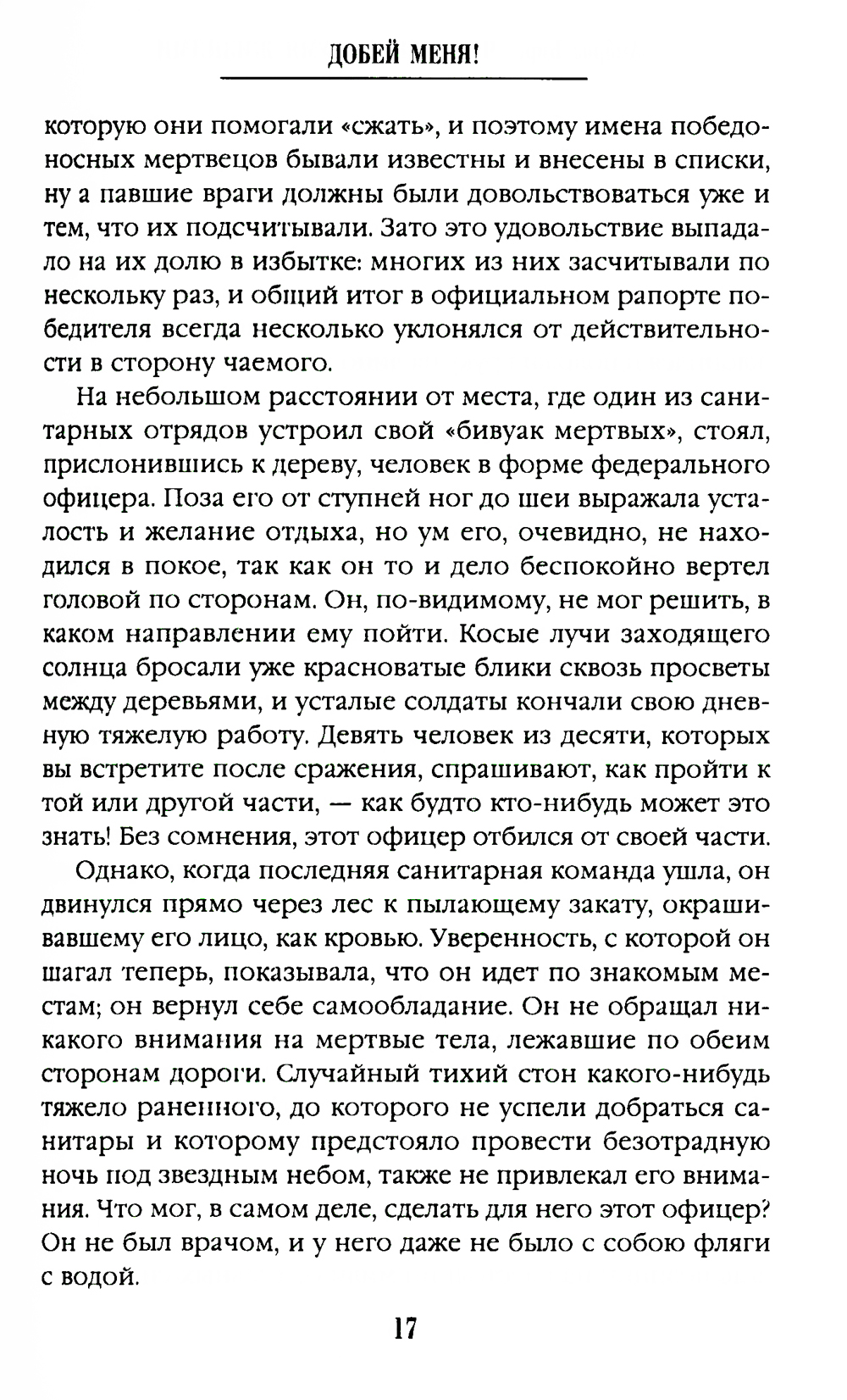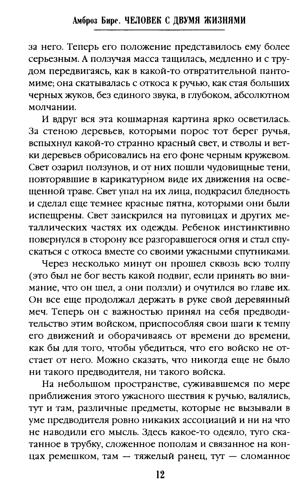 Амброз Гуиннет Бирс - признанный мастер американской прозы, участник судьбоносных событий, происходивших в США, журналист, писатель, автор «страшных» мистических рассказов, доводящих ужас до самого предела, был яркой своеобразной личностью. На поле боя, в обычной жизни, в статьях, в художественной прозе он был резок и прямолинеен, за что заработал прозвище Беспощадный Бирс. Воевал писатель в рядах северян, но в своих произведениях не высказывает предпочтения ни одной из воюющих сторон, - с обезоруживающей прямотой и шокирующей правдой он создает убийственно яркую, окрашенную мистическим туманом, картину войны с ее жестокостью, разрухой, гибелью людей и безрассудной, порой абсурдной храбростью.| Издательство | Центрполиграф |