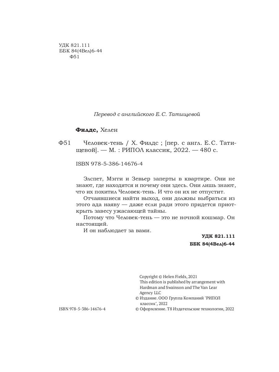 Элспет, Мэгги и Зевьер заперты в квартире. Они не знают, где находятся и почему они здесь. Они лишь знают, что их похитил Человек-тень. И что он их не отпустит. Отчаявшиеся найти выход, они должны выбраться из этого ада наяву - даже если ради этого придется приоткрыть завесу ужасающей тайны. Потому что Человек-тень - это не ночной кошмар. Он настоящий. И он наблюдает за вами.| Издательство | Рипол Классик |