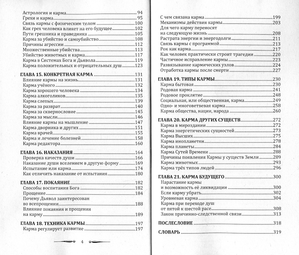 Карма - закон причинно-следственных связей, или, говоря бытовым языком, это отработка грехов и ошибок, т.е. неправильных поступков прошлой жизни, в настоящей. На энергетическом языке карма означает наработку душой через ряд сложных энергопроцессов энергий определенного качества с очисткой низких энергий, не способствующих ее эволюции. Из книги вы узнаете о законах построения и воплощения душ, космических и кармических причинах смерти, об энергопроцессах сознания в Том мире, о Страшном суде и Чистилище, механизмах действия кармы, ее типах (бытовой, профессиональной, родовой, социальной, народной). Информация для книги получена на основе контактов с Высшим Разумом.
