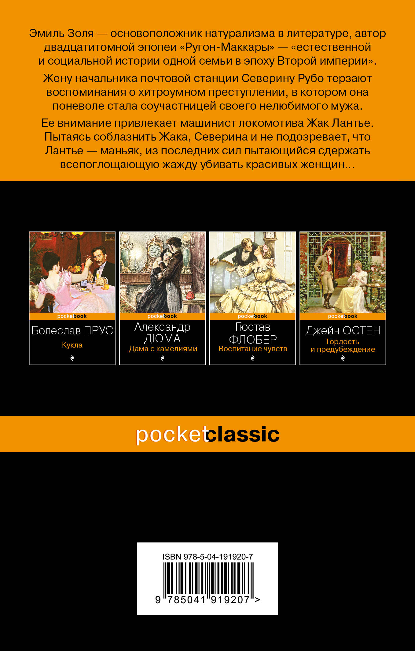 Эмиль Золя - основоположник натурализма в литературе, автор двадцатитомной эпопеи «Ругон-Маккары» - «естественной и социальной истории одной семьи в эпоху Второй империи». Жену начальника почтовой станции Северину Рубо терзают воспоминания о хитроумном преступлении, в котором она поневоле стала соучастницей своего нелюбимого мужа. Полиция так и не нашла виновных, но отныне семейная жизнь становится для молодой женщины совершенно невыносимой. Именно тогда ее внимание привлекает машинист локомотива Жак Лантье. Он хорош собой, не лишен обаяния, выгодно отличается от товарищей по высокооплачиваемой профессии чистым и аскетическим, почти монашеским образом жизни. Он кажется прямой противоположностью мелочному, жестокому и подлому Рубо. Однако, пытаясь соблазнить Жака, Северина и не подозревает, что играет со смертью. Ведь Лантье - маньяк, из последних сил пытающийся сдержать всепоглощающую жажду убивать красивых женщин...| Издательство | ООО "Издательство "Эксмо" |