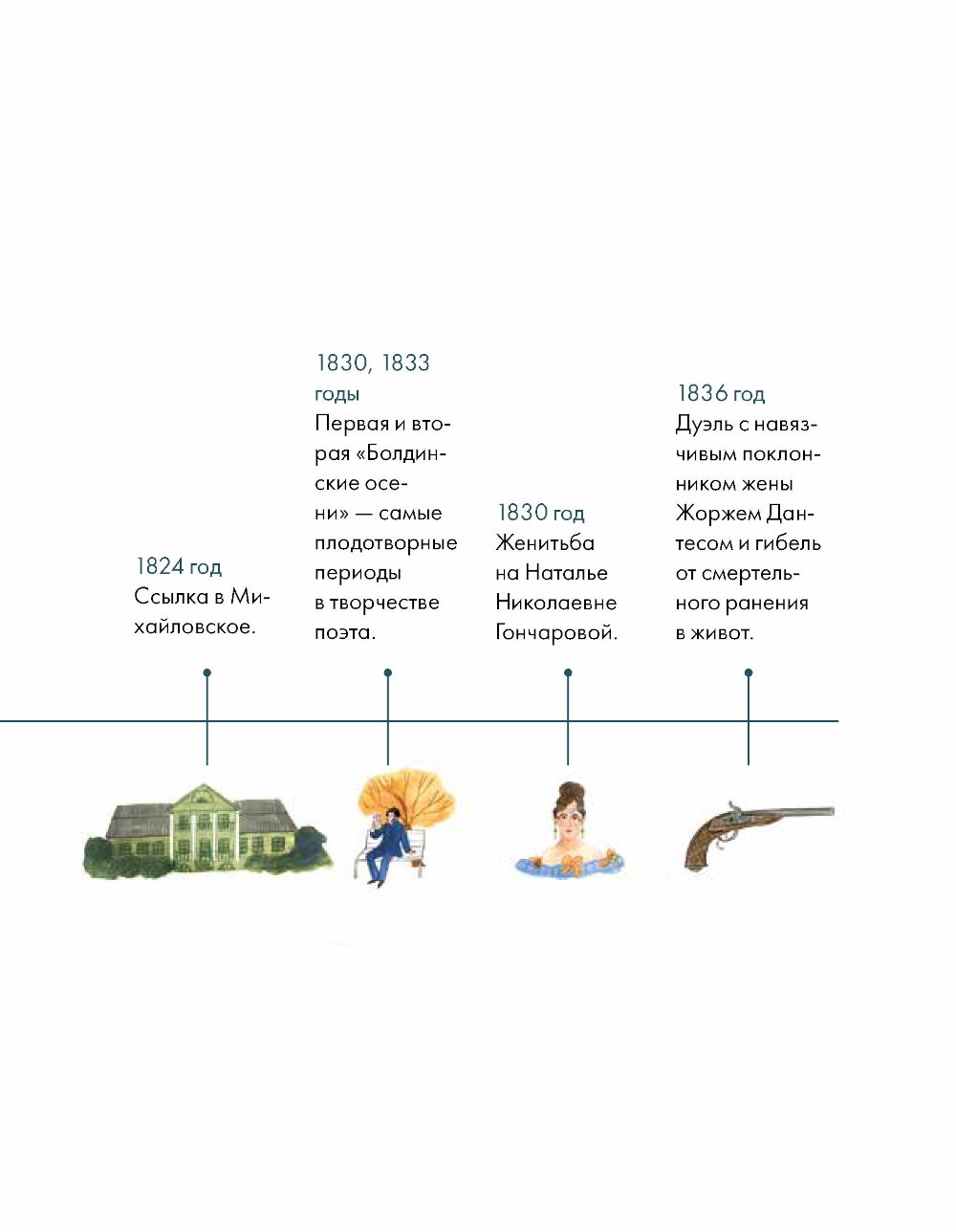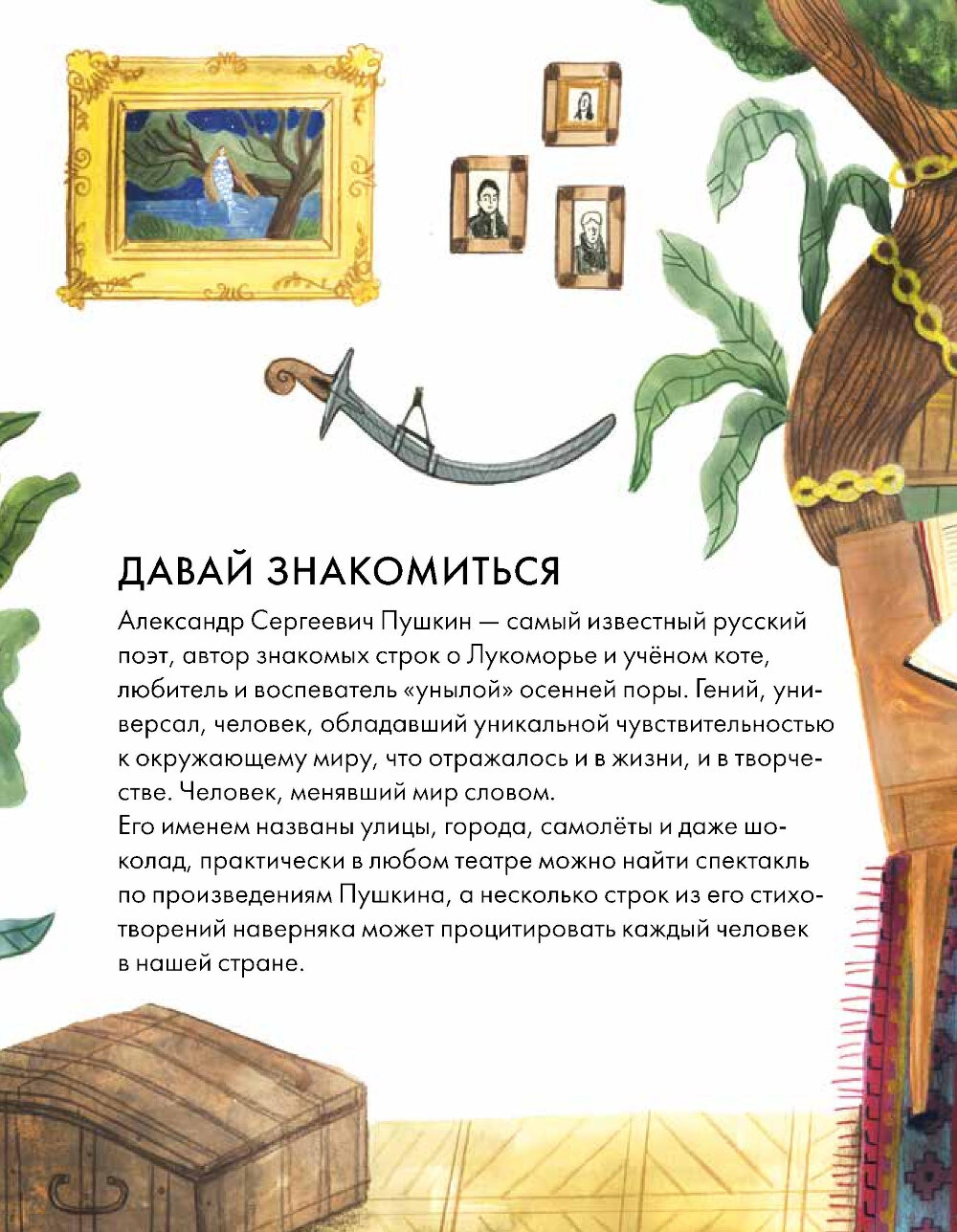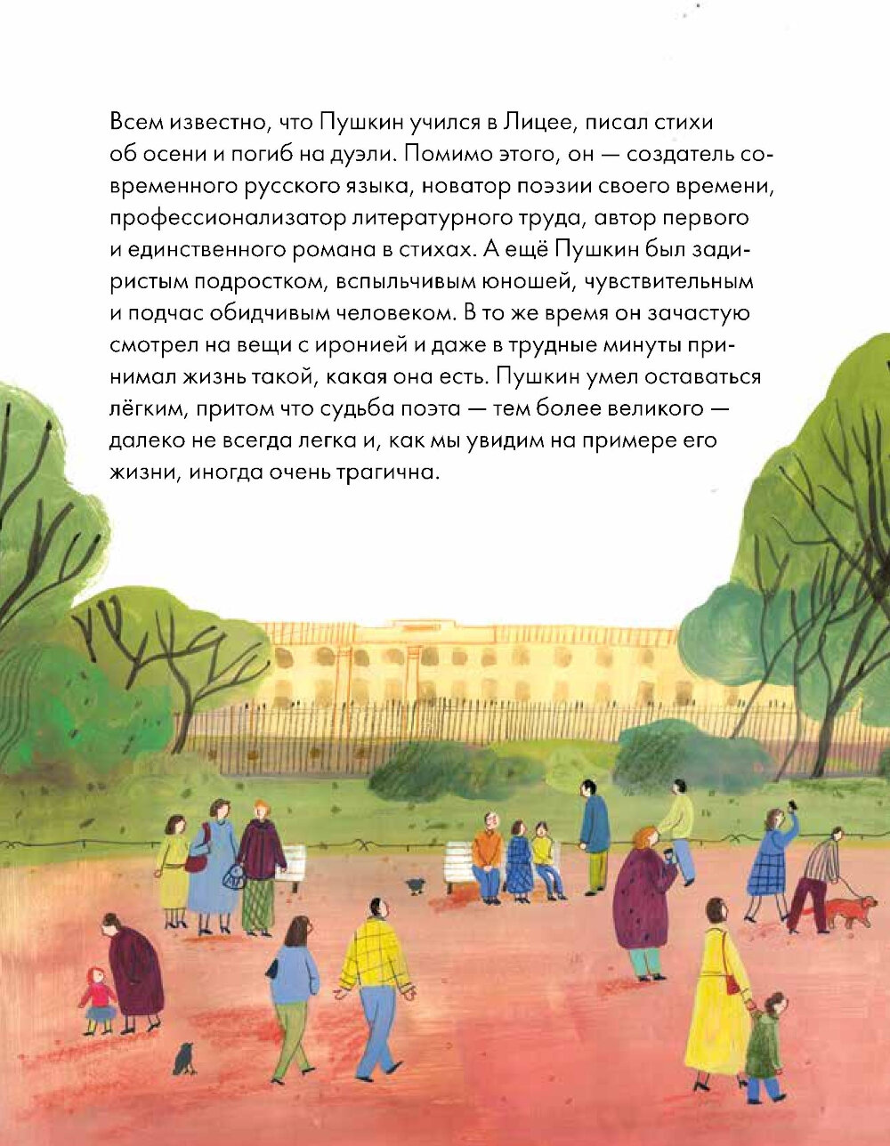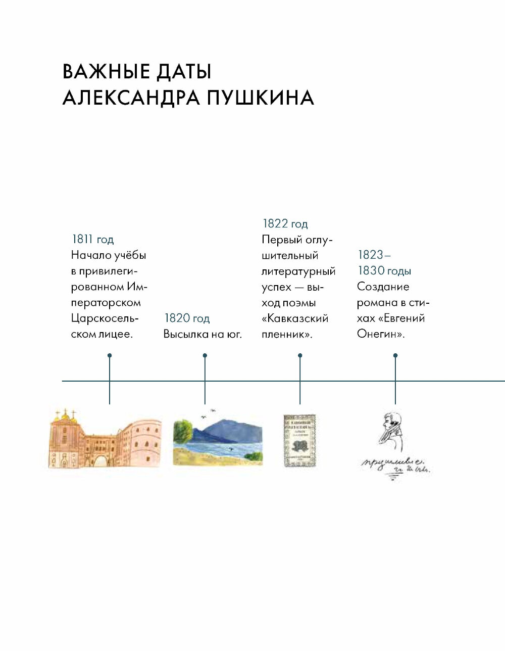 Александр Сергеевич Пушкин - самый известный русский поэт. Многие поколения детей росли и растут на его сказках, романы и лирику Пушкина изучают в школах, по произведениям ставятся спектакли и снимаются фильмы, и, наверное, практически каждый человек в нашей стране может процитировать его стихотворения. И конечно, всем известны факты из биографии Александра Сергеевича: он учился в Лицее, был дружен с декабристами, неоднократно отправлялся в ссылки и погиб на дуэли. Но не так много мы знаем о том, каким же человеком был великий поэт. Эта краткая иллюстрированная биография расскажет о жизни Александра Сергеевича Пушкина. Кем он работал после окончания Лицея? Как ему удалось сделать писательство настоящей профессией? Почему Пушкин охотно делился идеями произведений, хотя сам зарабатывал литературным трудом? А ещё о том, почему важно оттачивать свои таланты, даже будучи признанным гением, ценить дружбу и оставаться верным своим идеалам.| Издательство | Альпина Паблишер |