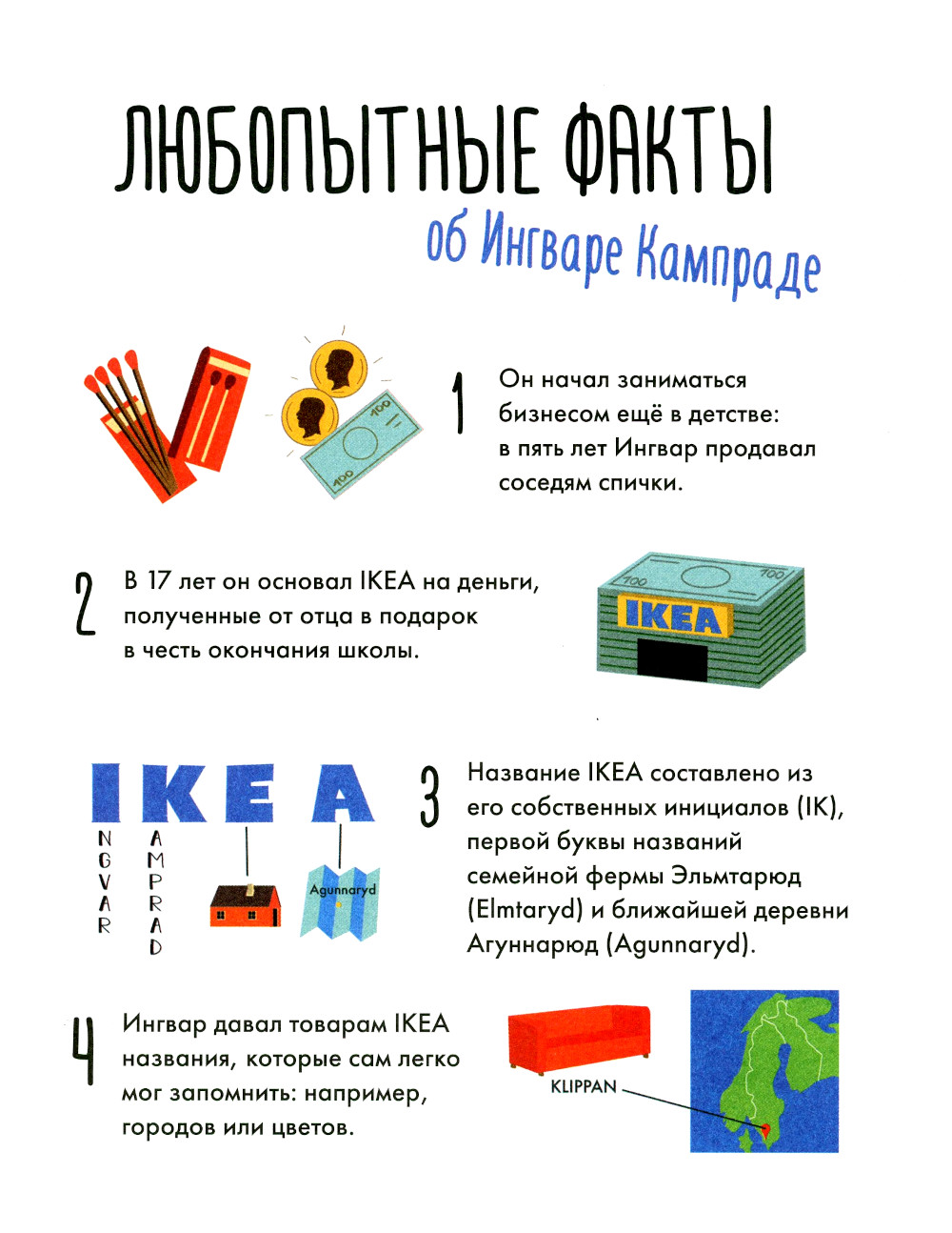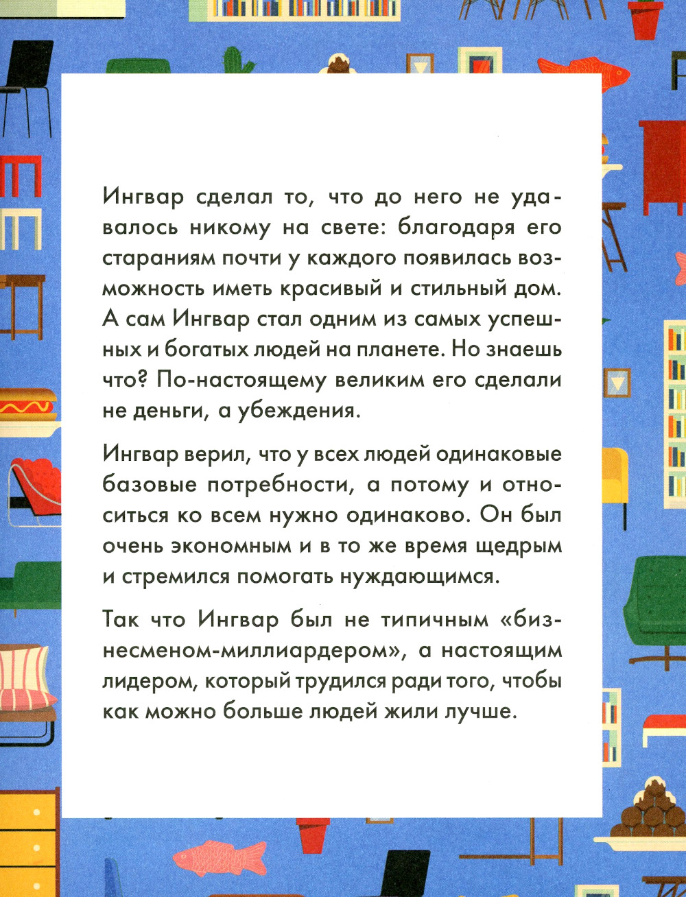Ингвар Кампрад - основатель всемирно известной компании IKEA, один из самых успешных бизнесменов планеты. В иллюстрированной биографии авторы показывают, как важно порой смотреть на проблемы с другой стороны, чтобы придумать что-то новое и свежее, и насколько полезно разумно тратить отведенные тебе время, деньги и прочие жизненные ресурсы.| Издательство | Альпина Паблишер |
