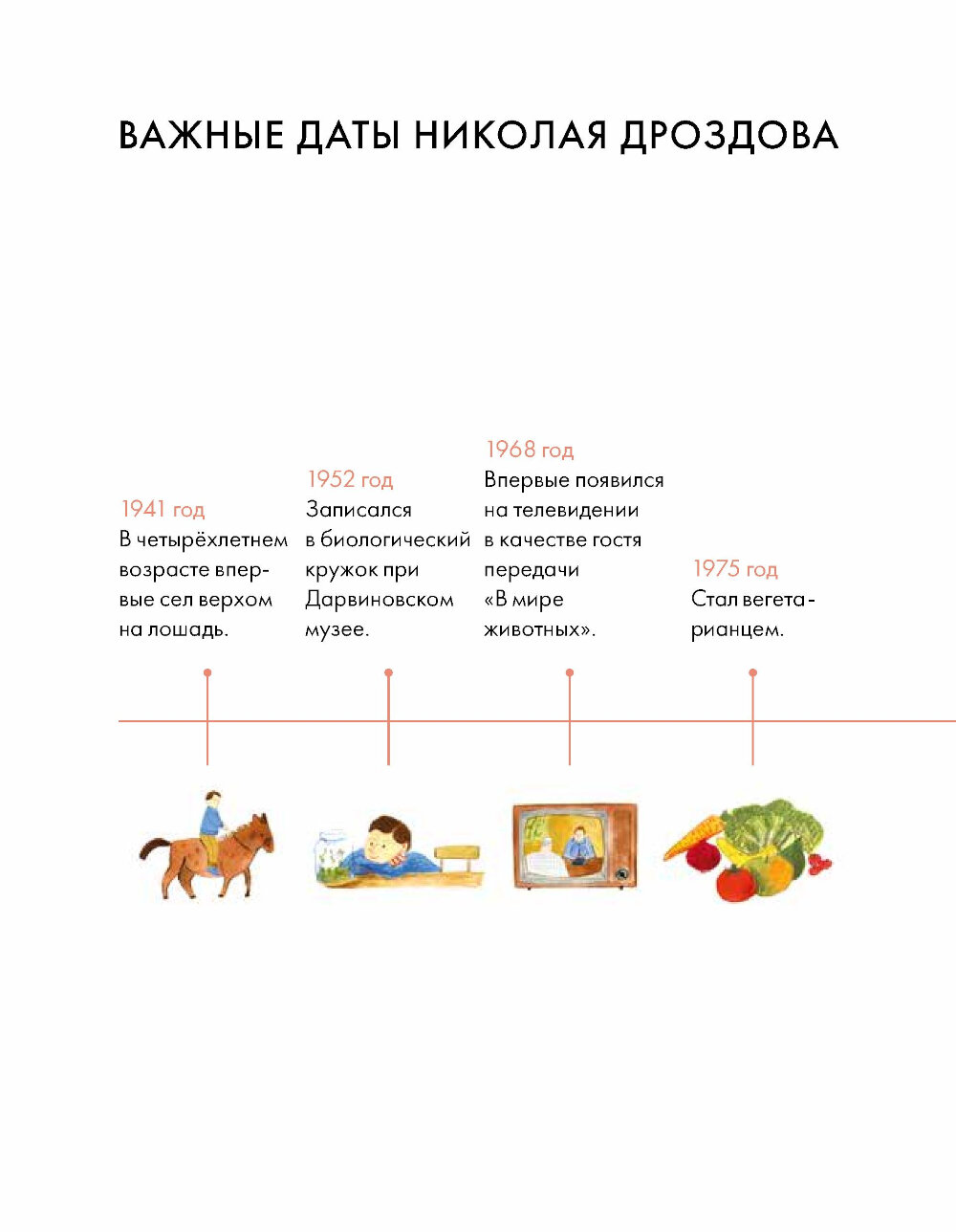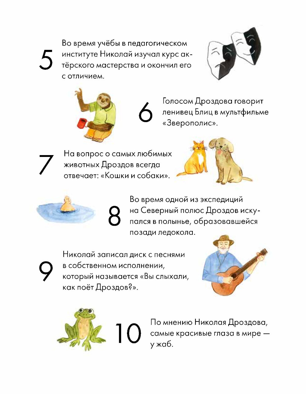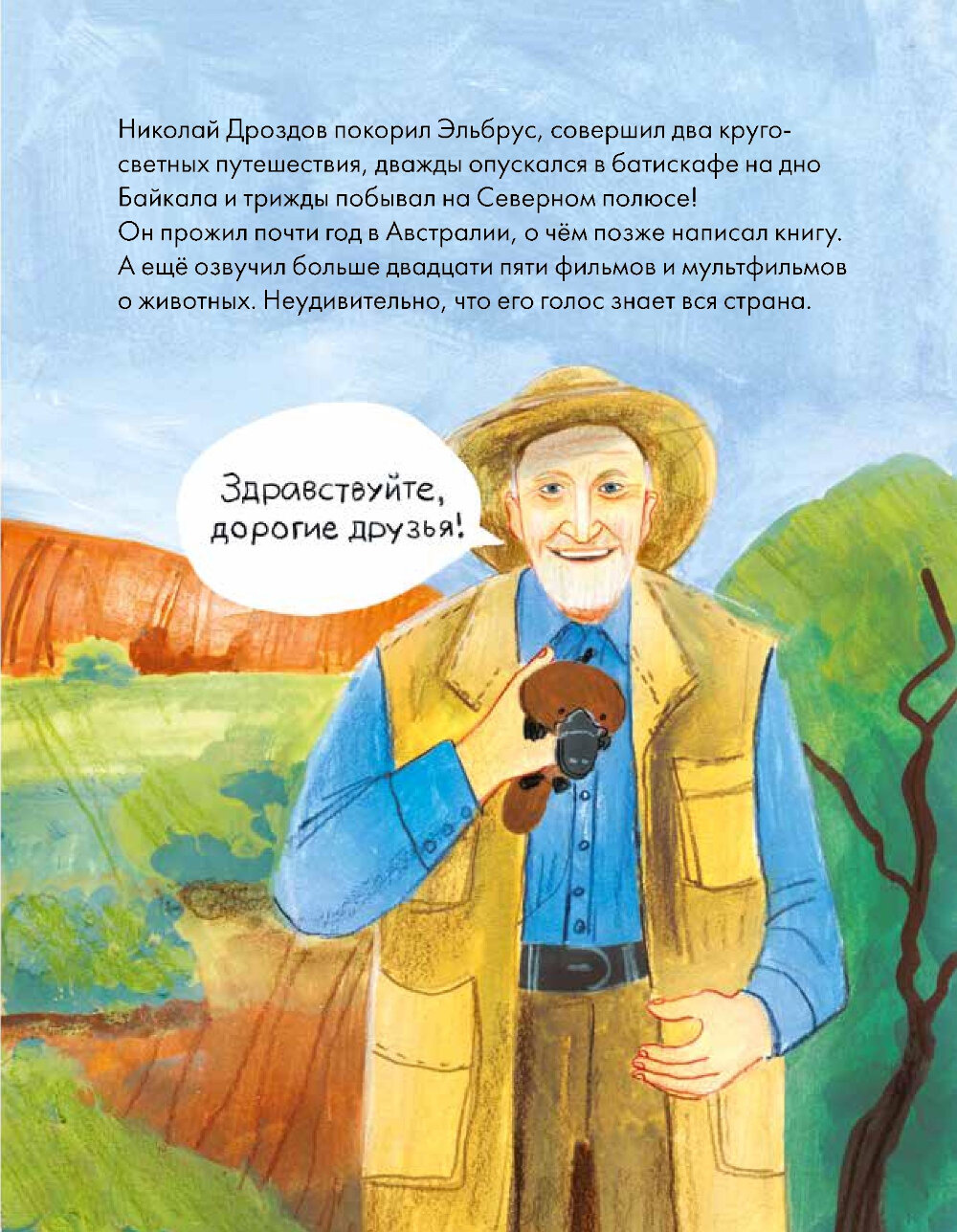 Николай Николаевич Дроздов - исследователь, путешественник и любимый многими телеведущий нашей страны. За более чем сорок лет работы на телевидении он изменил привычный нам образ учёного. Оказалось, что доктору наук и профессору не обязательно с утра до ночи пропадать в лабораториях и корпеть над научными статьями. Он может записывать музыкальные альбомы, участвовать в КВН, сниматься в реалити-шоу, озвучивать мультфильмы и при этом оставаться настоящим учёным! Но главное - Николай Дроздов показывает нам пример безграничной любви ко всему живому. Эта краткая иллюстрированная биография расскажет о жизни популярного телеведущего. Кем Николай Николаевич мечтал стать в детстве, как попал на телевидение и какое место на нашей планете его самое любимое. А ещё о том, как находить подход к самым разным, порой даже опасным животным, что нужно, что стать любимым аудиторией и почему важно вести здоровый образ жизни.| Издательство | Альпина Паблишер |