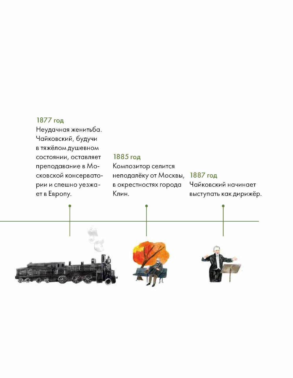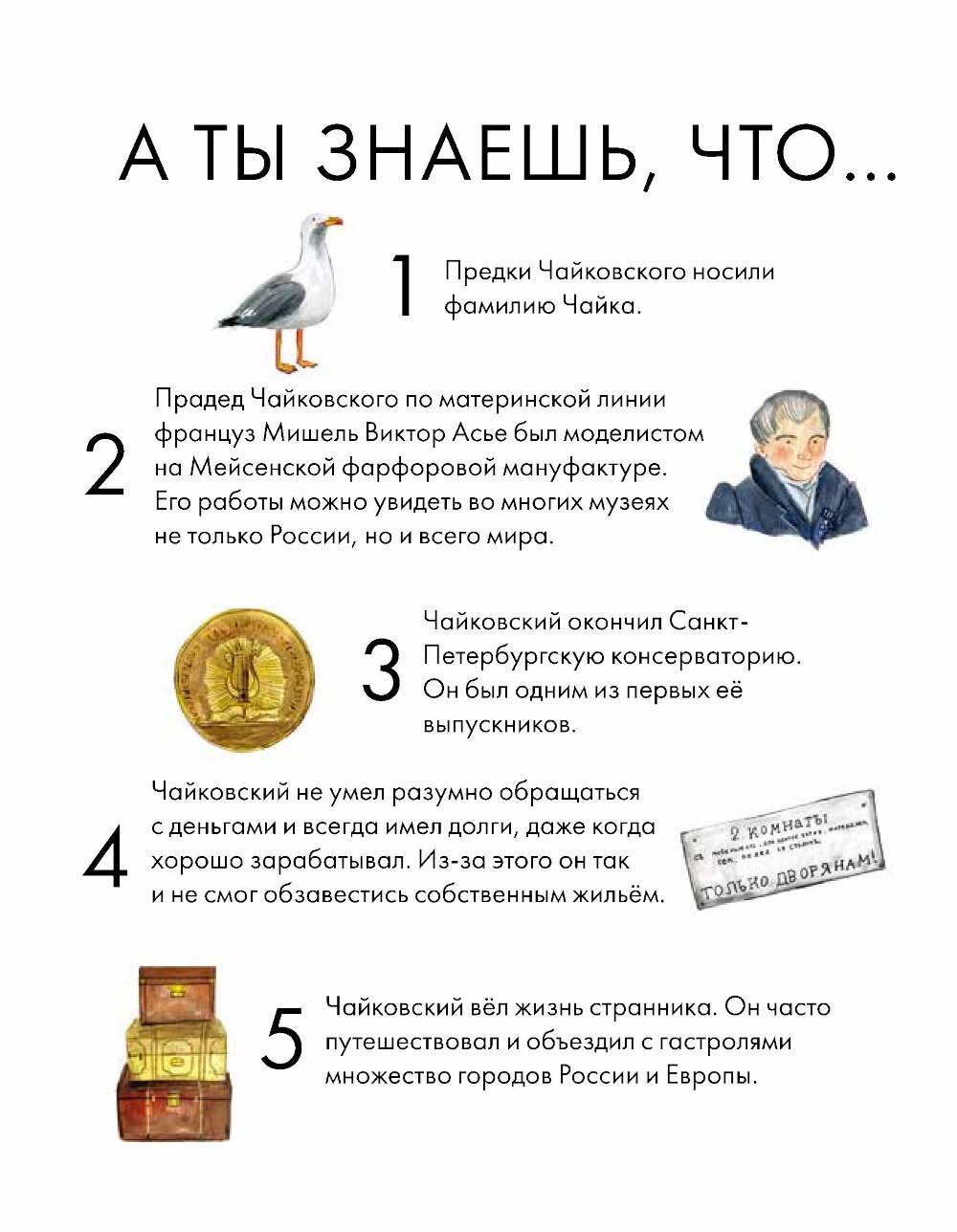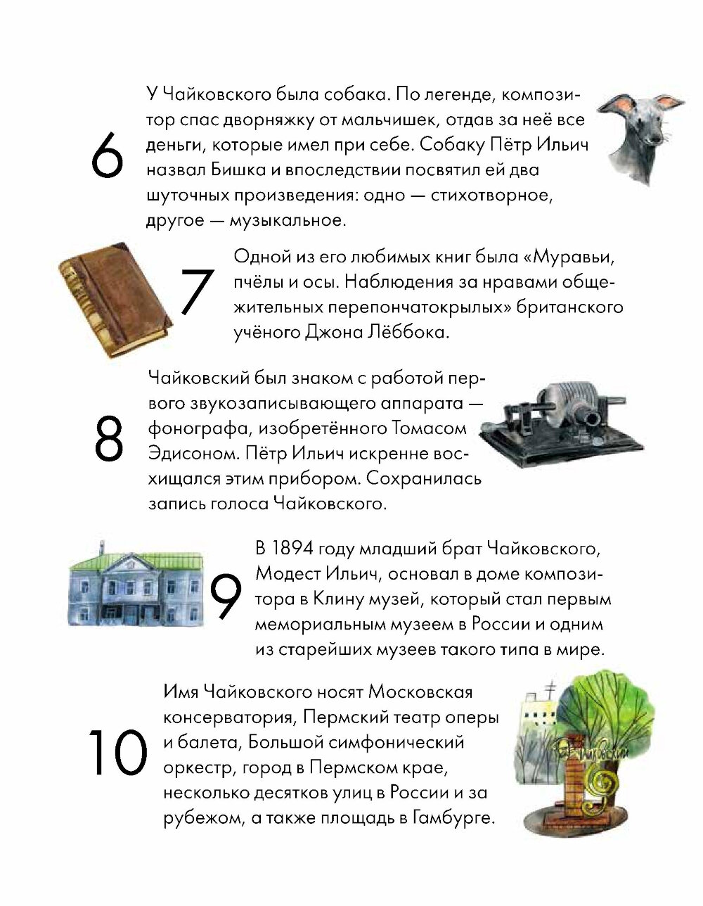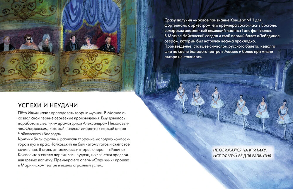 Чайковский жил более 150 лет назад, но его музыка интересна и сегодня, ее слушают и узнают люди разных стран, возрастов и культур. Сочинения Чайковского звучат не только со сцен серьезных концертных залов и оперных театров - ее можно услышать в художественных фильмах, в рекламе, в компьютерных играх. Всего Петр Ильич создал 440 музыкальных произведений: 11 опер, 3 балета, 7 симфоний, музыку для фортепиано, кантаты, сюиты, увертюры и множество других произведений. Эта краткая иллюстрированная биография расскажет о жизни великого композитора: как прошло его детство и почему он решил заниматься музыкой только став взрослым, как критики встретили его первые работы и какое свое произведение Петр Ильич считал шедевром. Вы узнаете о роли друзей в жизни Чайковского, его полезных привычках и увлечениях, помимо музыки. А еще вдохновитесь следовать мечте и призванию, несмотря ни на какие условности!| Издательство | Альпина Паблишер |