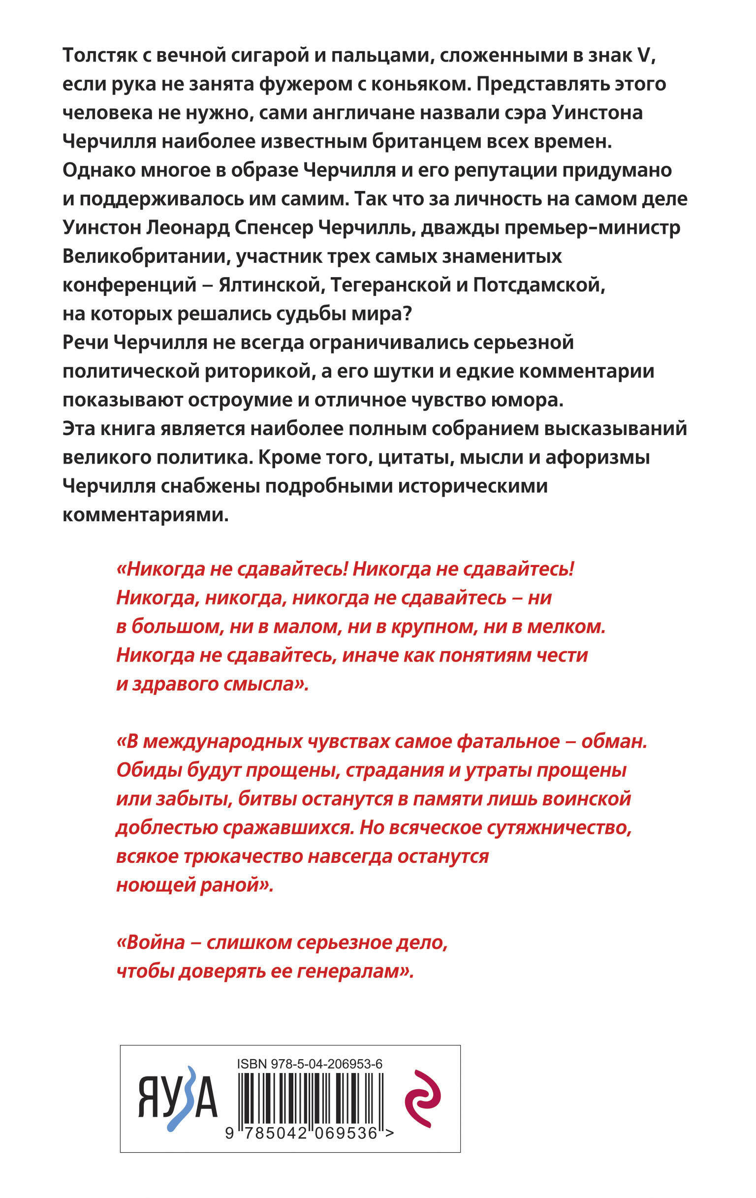 Толстяк с вечной сигарой и пальцами, сложенными в знак V, если рука не занята фужером с коньяком. Представлять этого человека не нужно, сами англичане назвали сэра Уинстона Черчилля наиболее известным британцем всех времен. Однако многое в образе Черчилля и его репутации придумано и поддерживалось им самим. Так что за личность на самом деле Уинстон Леонард Спенсер Черчилль, дважды премьер-министр Великобритании, участник трех самых знаменитых конференций - Ялтинской, Тегеранской и Потсдамской, на которых решались судьбы мира? Речи Черчилля не всегда ограничивались серьезной политической риторикой, а его шутки и едкие комментарии показывают остроумие и отличное чувство юмора. Эта книга является наиболее полным собранием высказываний великого политика. Кроме того, цитаты, мысли и афоризмы Черчилля снабжены подробными историческими комментариями. «Никогда не сдавайтесь! Никогда не сдавайтесь! Никогда, никогда, никогда не сдавайтесь - ни в большом, ни в малом, ни в крупном, ни в мелком. Никогда не сдавайтесь, иначе как понятиям чести и здравого смысла». «В международных чувствах самое фатальное - обман. Обиды будут прощены, страдания и утраты прощены или забыты, битвы останутся в памяти лишь воинской доблестью сражавшихся. Но всяческое сутяжничество, всякое трюкачество навсегда останутся ноющей раной». «Война - слишком серьезное дело, чтобы доверять ее генералам».