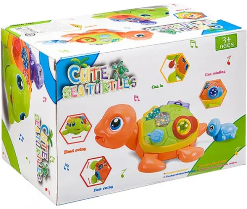 Черепашка на батарейках с произвольным движением, мелодией, миганием ламп на панцире. Во время движения черепашка качает головой из стороны в сторону, движутся лапы. Телефончик и фляжка закреплены на верёвочках с пружиной (можно потянуть на себя телефон, но после того, как усилие ослаблено, телефончик вернётся на своё место - притянется к панцирю). Чемоданчик на панцире открывается. Маленькая черепашка - отдельная игрушка с колёсиками (без механизма).