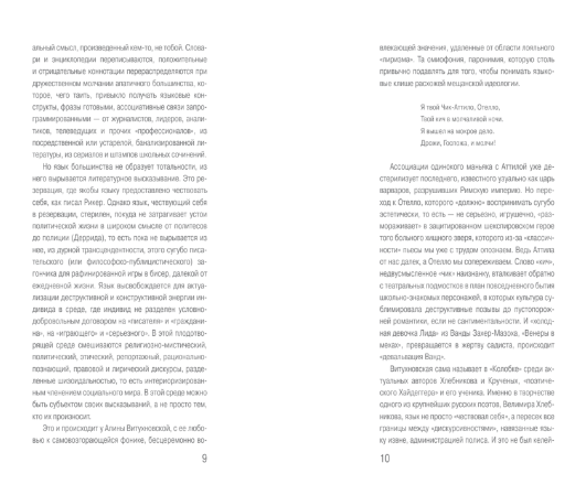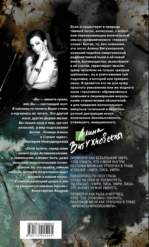 Если и существует в природе темный логос, антислово, с избытком перекрывающее изначальный смысл профанического "первого слова" Бытия, то без сомнения, это логос Алины Витухновской, осевший подобно смертоносной радиоактивной пыли в ее новой книге. Антивещество, включенное в ее состав, гарантирует мыслящему читателю не только "разрыв шаблонов", но и уничтожение той подложки, к которой они прикреплены. И делается это не для нужд простого увеселения или же модного ныне "троллинга" обремененных ложными и лицемерными моральными стереотипами обывателей, а для придания колоссального импульса тотальной и безоговорочной деструкции всего изначально-бессмысленного, отжившего, инерционного.