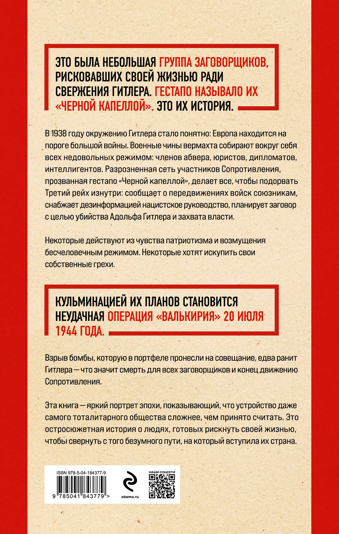 Детективная история антигитлеровского заговора в Германии - от возникновения Третьего рейха до конца Второй мировой войны. В 1938 году окружению Гитлера стало понятно: Европа на пороге большой войны. Военные чины вермахта и члены абвера собирают вокруг себя всех недовольных режимом юристов, дипломатов и интеллигентов. Разрозненная сеть участников сопротивления, прозванного гестапо «Черной капеллой», делает все, чтобы не допустить кровопролития и подорвать Третий рейх изнутри: сообщает союзникам о передвижениях войск, снабжает дезинформацией нацистское руководство, планирует заговор с целью убийства Адольфа Гитлера. Среди заметных участников антигитлеровской ячейки - полковник Ханс Остер, богослов Дитрих Бонхёффер и его зять Ганс фон Донаньи, штатный сотрудник абвера, военной разведки Германии. По мере затягивания войны заговор ширится: «Черную капеллу», искавшую способ убрать Гитлера и воплотить план по захвату власти, поддерживают главнокомандующий и начальник генштаба. Кульминацией становится операция «Валькирия» - неудачное покушение на Гитлера 20 июля 1944 года. Взрыв бомбы, которую в портфеле пронесли на совещание, едва ранит Гитлера - что означает неминуемую смерть для всех заговорщиков. Увлекательная и остросюжетная, книга «Черная капелла» - это история о людях, готовых рискнуть своей жизнью, чтобы свернуть с того безумного пути, на который вступила их страна.| Издательство | ООО "Издательство "Эксмо" |