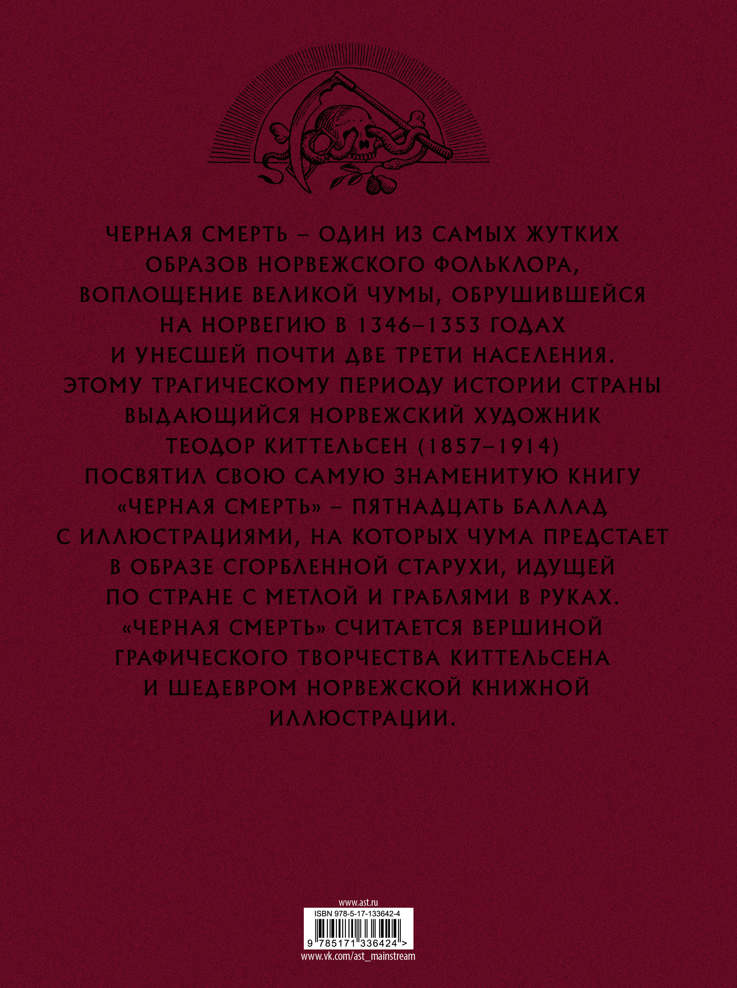 Черная Cмерть - один из самых жутких образов норвежского фольклора, воплощение великой чумы, обрушившейся на Норвегию в 1346-1353 годах и унесшей почти две трети населения. Этому трагическому периоду истории страны выдающийся норвежский художник Теодор Киттельсен (1857-1914) посвятил свою самую знаменитую книгу "Черная Смерть" - пятнадцать баллад с иллюстрациями, на которых чума предстает в образе сгорбленной старухи, идущей по стране с метлой и граблями в руках. "Черная Смерть" считается вершиной графического творчества Киттельсена и шедевром норвежской книжной иллюстрации.| Издательство | ИЗДАТЕЛЬСТВО "АСТ" |