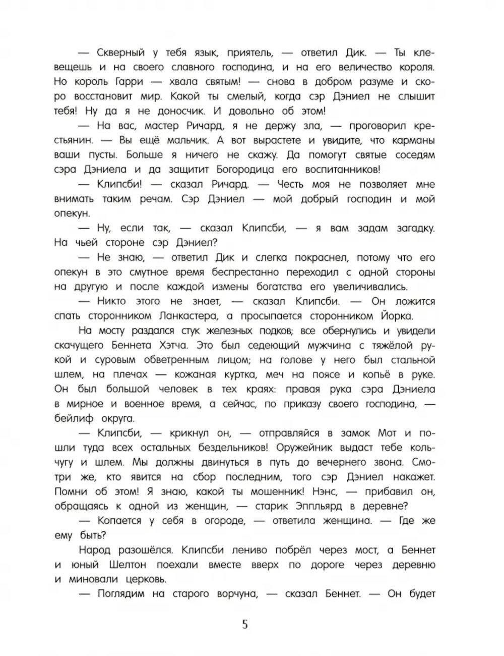 «Смутное время» в Англии, XV век, война Алой и Белой Розы за английский престол. Сэр Дэниэл Брэкли, опекун юного Ричарда Шелтона, сражается то на одной, то на другой стороне, взвешивая свою выгоду, и Ричард беспрекословно верит ему, пока одна встреча за другой не открывают ему глаза на беспринципность и коварство того, кто заменил ему отца - но и прибрал к рукам его имение. Грандиозные битвы и трактирные драки, побеги и похищения, переодевания и разоблачения, симпатия, перерастающая в настоящую любовь, юмор и тонкий психологизм - в этом романе не найдётся ни одного «картонного» персонажа, ни одной затянутой сцены, ни одной лишней сюжетной линии. Классический роман-приключение выходит с иллюстрациями Анатолия Иткина. Кому понравится: всем, кто любит закрученный сюжет с опасными приключениями, переодеваниями, сражениями, предательствами, разоблачениями и настоящей романтикой.| Издательство | Изд. Лабиринт Пресс |