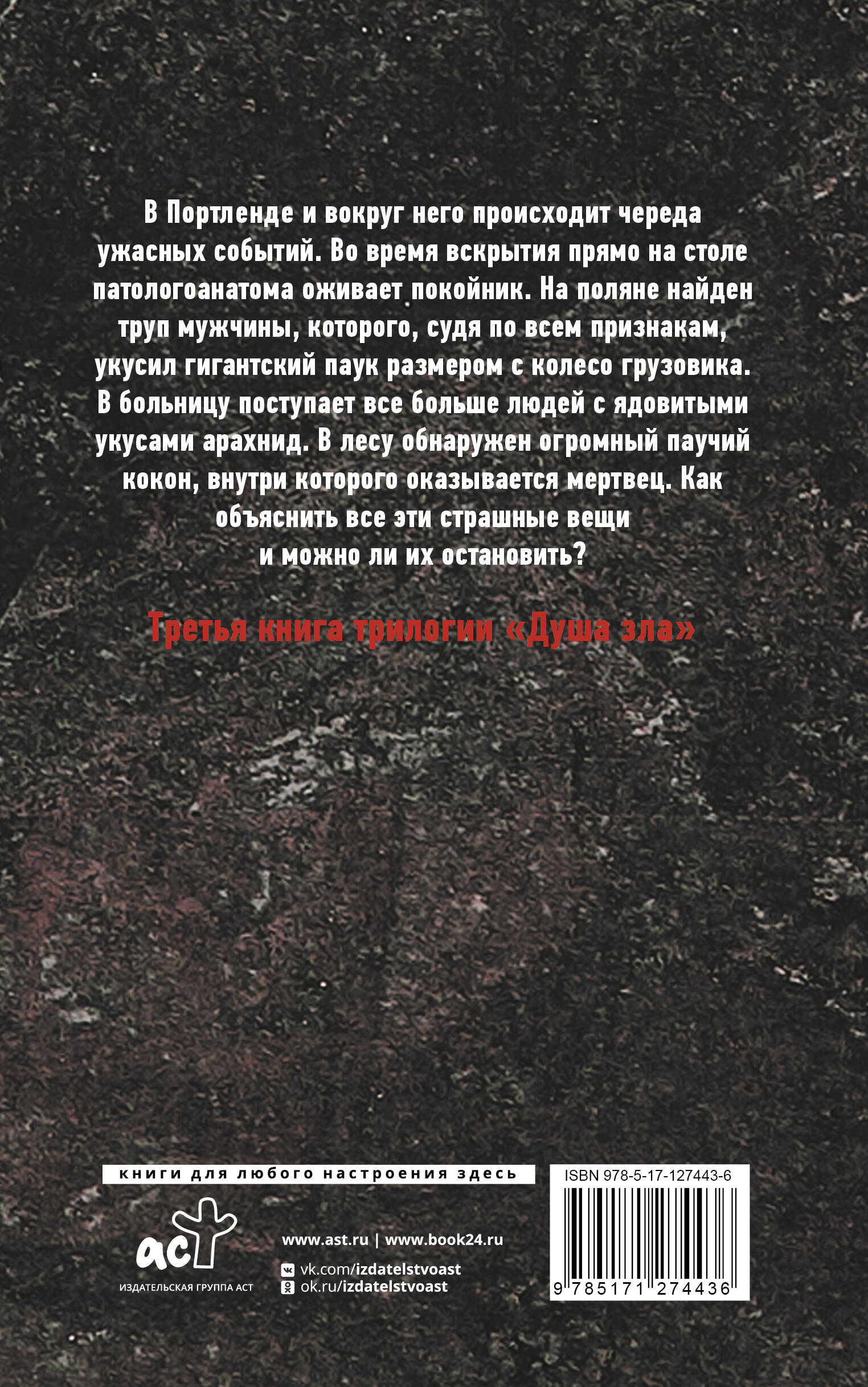 В Портленде и вокруг него происходит череда ужасных событий. Во время вскрытия прямо на столе паталогоанатома оживает покойник. На поляне найден труп мужчины, которого, судя по всем признакам, укусил гигантский паук размером с колесо грузовика. В больницу поступает все больше людей с ядовитыми укусами арахнид. В лесу обнаружен огромный паучий кокон, внутри которого оказывается мертвец. Как объяснить все эти страшные вещи и можно ли их остановить? Третья книга трилогии "Душа зла".| Издательство | ИЗДАТЕЛЬСТВО "АСТ" |