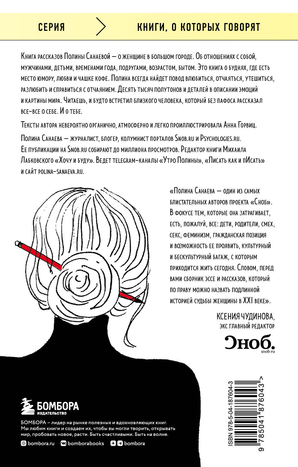 Об авторе Полина Санаева - журналист, блогер, колумнист порталов Snob.ru и Psychologies.ru. Ее публикации на Snob.ru собирают до миллиона просмотров. Редактор книги Михаила Лабковского «Хочу и буду». Ведет страницу на «Женщина-женщина» на Facebook и сайт www.polinasanaeva.ru «Полина Санаева - автор замечательных рассказов. Она владеет весьма редким даром говорить о том, что ее пугает и мучает. На фоне всеобщего хвастовства и самодовольства ее книга поражает интимностью. Наедине с ней читатель может признаться себе во всем. Даже в том, о чем молчит наедине с собой». - Дмитрий Быков, писатель, публицист, теле- и радиоведущий, журналист
