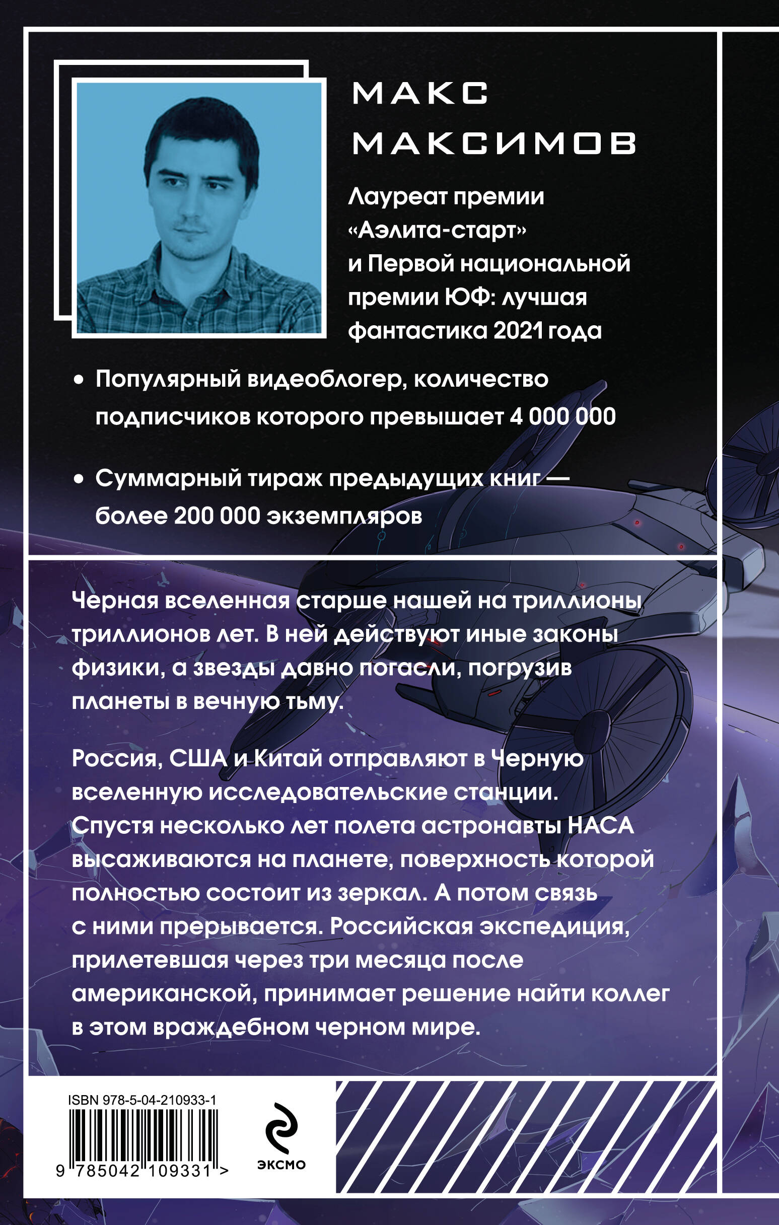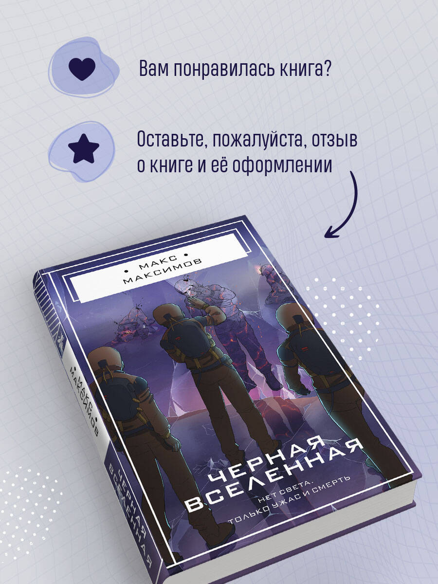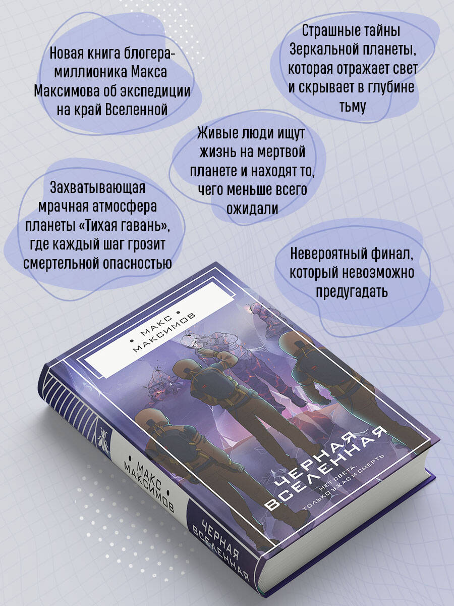 Черная Вселенная старше нашей на триллионы триллионов лет. В ней действуют иные законы физики, а звезды давно погасли, погрузив планеты в вечную тьму. Россия, США и Китай отправляют в Черную Вселенную исследовательские станции. Спустя несколько лет полета астронавты НАСА высаживаются на планете, поверхность которой полностью состоит из зеркал. А потом связь с ними прерывается. Российская экспедиция, прилетевшая через три месяца после американцев, принимает решение найти коллег в этом враждебном черном мире. «Черная Вселенная» Макса Максимова теперь в бумаге! Космическая фантастика и постоянное нагнетание саспенса. Исследование чужого и враждебного мира. Уникальная планета, состоящая из зеркал. Нечто ужасное скрывается во тьме Черной Вселенной. Невероятный финал, взрывающий мозг.| Издательство | ООО "Издательство "Эксмо" |