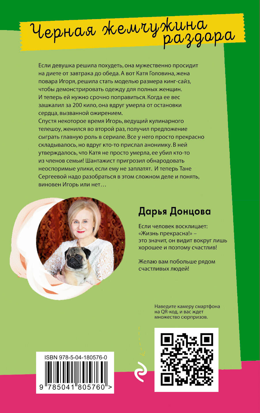 Дарья Донцова - самый популярный и востребованный автор в нашей стране, любимица миллионов читателей. В России продано более 200 миллионов экземпляров ее книг. Ее творчество наполняет сердца и души светом, оптимизмом, радостью, уверенностью в завтрашнем дне! Если девушка решила похудеть, она мужественно просидит на диете от завтрака до обеда. А вот Катя Головина, жена повара Игоря, решила стать моделью размера кинг-сайз, чтобы демонстрировать одежду для полных женщин. И теперь ей нужно срочно поправиться. Когда ее вес зашкалил за 200 кило, она вдруг умерла от остановки сердца, вызванной ожирением. Спустя некоторое время Игорь, ведущий кулинарного телешоу, женился во второй раз, получил предложение сыграть главную роль в сериале. Все у него просто прекрасно складывалось, но вдруг кто-то прислал анонимку. В ней утверждалось, что Катя не просто умерла, ее убил кто-то из членов семьи! Шантажист пригрозил обнародовать неоспоримые улики, если ему не заплатят. И теперь Тане Сергеевой надо разобраться в этом сложном деле и понять, виновен Игорь или нет… «Донцова невероятная работяга! Я не знаю ни одного другого писателя, который столько работал бы. Я отношусь к ней с уважением, как к образцу писательского трудолюбия. Женщины нуждаются в психологической поддержке и получают ее от Донцовой. Я и сама в свое время прочла несколько романов Донцовой. Ее читают очень разные люди. И очень занятые бизнес-леди, чтобы на время выключить голову, и домохозяйки, у которых есть перерыв 15-20 минут между отвести-забрать детей». - Галина Юзефович, литературный критик