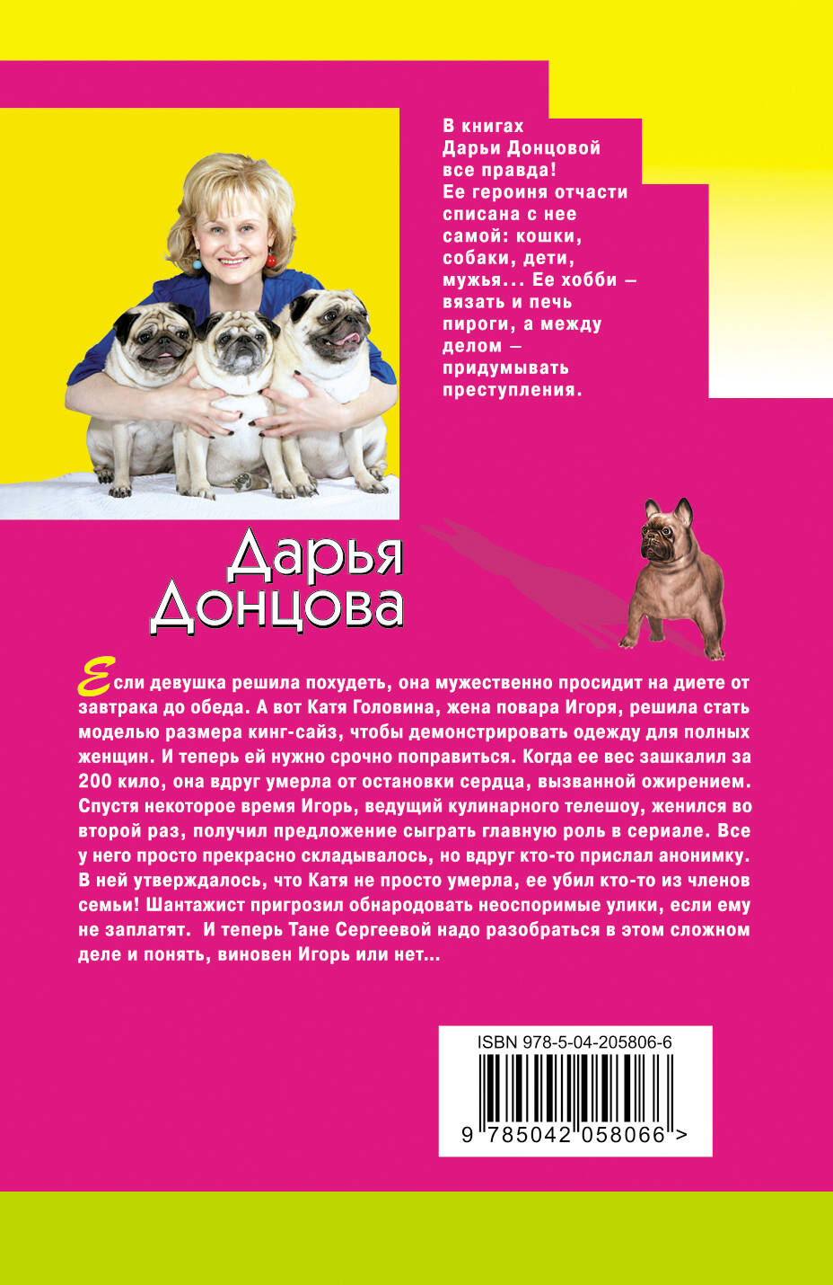 Если девушка решила похудеть, она мужественно просидит на диете от завтрака до обеда. А вот Катя Головина, жена повара Игоря, решила стать моделью размера кинг-сайз, чтобы демонстрировать одежду для полных женщин. И теперь ей нужно срочно поправиться. Когда ее вес зашкалил за 200 кило, она вдруг умерла от остановки сердца, вызванной ожирением. Спустя некоторое время Игорь, ведущий кулинарного телешоу, женился во второй раз, получил предложение сыграть главную роль в сериале. Все у него просто прекрасно складывалось, но вдруг кто-то прислал анонимку. В ней утверждалось, что Катя не просто умерла, ее убил кто-то из членов семьи! Шантажист пригрозил обнародовать неоспоримые улики, если ему не заплатят. И теперь Тане Сергеевой надо разобраться в этом сложном деле и понять, виновен Игорь или нет… Дарья Донцова - самый популярный и востребованный автор в нашей стране, любимица миллионов читателей. В России продано более 200 миллионов экземпляров ее книг. Детективы Дарьи Донцовой написаны в особой манере: помимо интереснейшего сюжета, в них всегда присутствует тонкий юмор, здравый оптимизм и безусловная вера в торжество добра над злом. Это всё, что нужно для отдыха, релаксации и душевного успокоения. Прочтите книги Дарьи, и ваши сердца и души наполнятся светом, оптимизмом, радостью, уверенностью в завтрашнем дне! Они заразят вас желанием жить, радоваться каждому дню и верить в лучшее. -------------------------------------------------- «Донцова невероятная работяга! Я не знаю ни одного другого писателя, который столько работал бы. Я отношусь к ней с уважением, как к образцу писательского трудолюбия. Женщины нуждаются в психологической поддержке и получают ее от Донцовой. Я и сама в свое время прочла несколько романов Донцовой. Ее читают очень разные люди. И очень занятые бизнес-леди, чтобы на время выключить голову, и домохозяйки, у которых есть перерыв 15-20 минут между отвести-забрать детей». - Галина Юзефович, литературный критик «У Дарьи вся детективная закваска всего лишь фон для раскрытия характеров, взаимоотношений между людьми. Всегда есть интрига, и до последнего эпизода непонятно, что, как и почему. В этом смысле условия жанра абсолютно выполняются. Дарья Донцова, конечно, одна из лучших». - Дмитрий Харатьян «Давно начала читать, и так втянулась! И сейчас читаю романы Дарьи. Я отдыхаю за ними. Сама Донцова интеллигентная женщина, у нее мягкий юмор и нестрашный сюжет, все с позитивом и надеждой на хороший конец. Это прекрасно». - Лариса Удовиченко| Издательство | ООО "Издательство "Эксмо" |