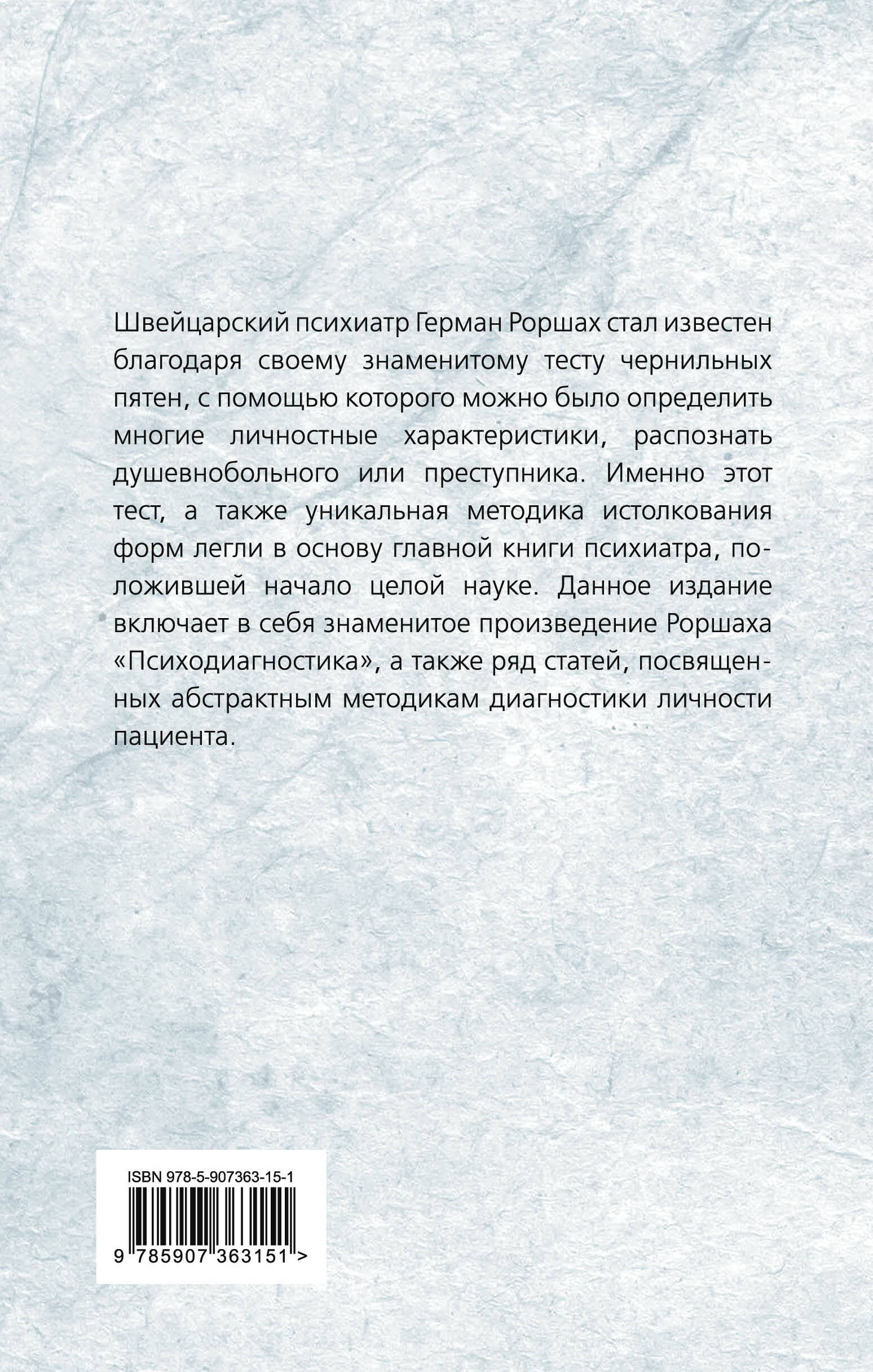 Швейцарский психиатр Герман Роршах известен благодаря своему знаменитому тесту чернильных пятен, с помощью которого можно было определить многие личностные характеристики, распознать душевнобольного или преступника. Именно этот тест, а также уникальная методика истолкования форм легли в основу главной книги психиатра, положившей начало целой науке. Данное издание включает в себя знаменитое произведение Роршаха «Психодиагностика», а также ряд статей, посвященных абстрактным методикам диагностики личности пациента.| Издательство | Агентство Алгоритм ООО |
