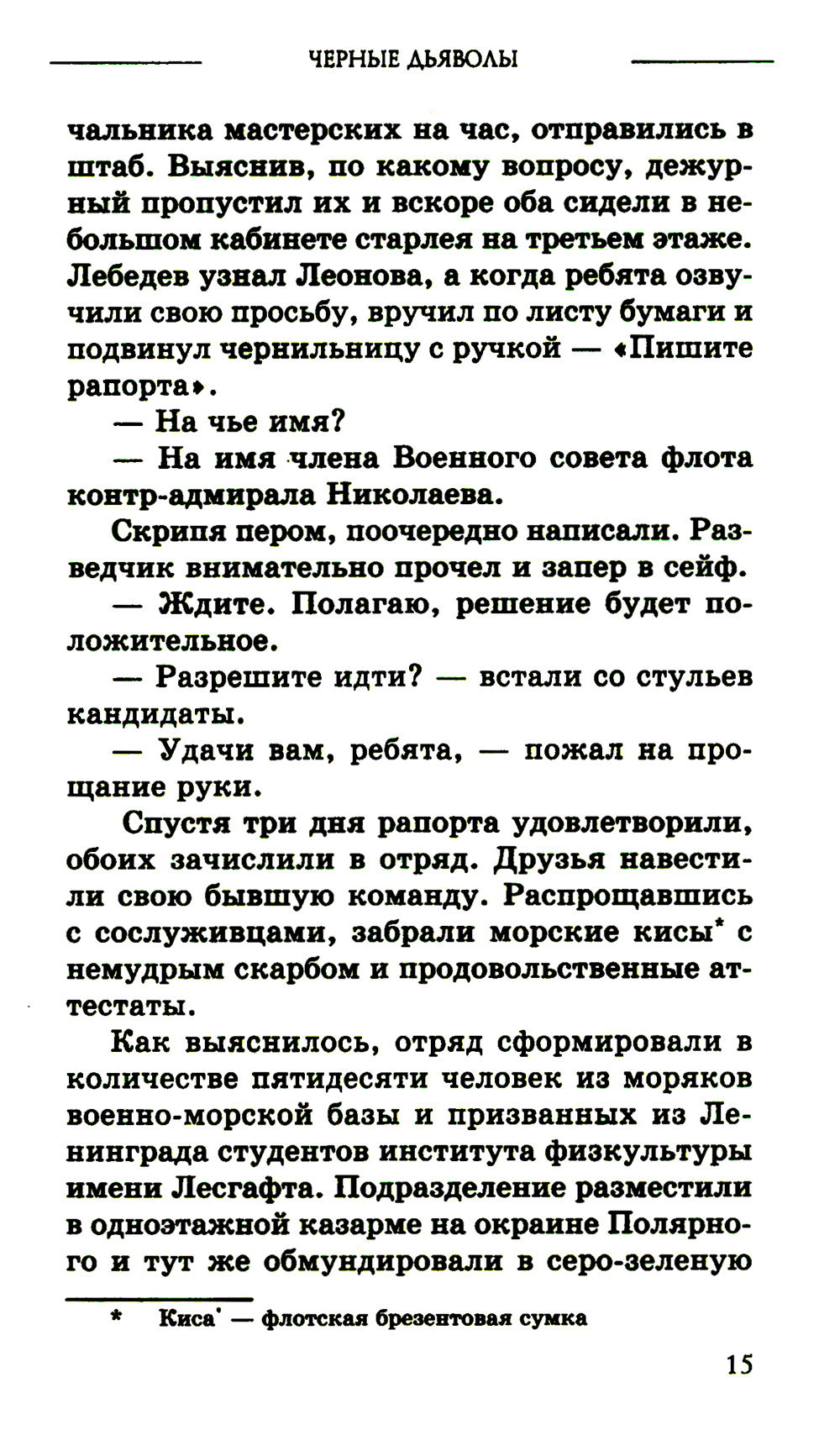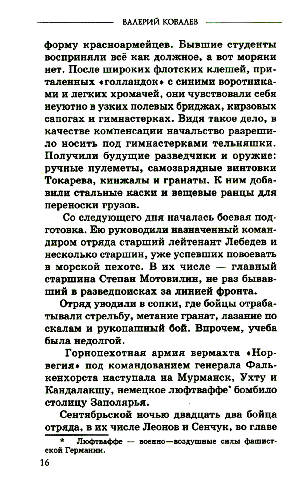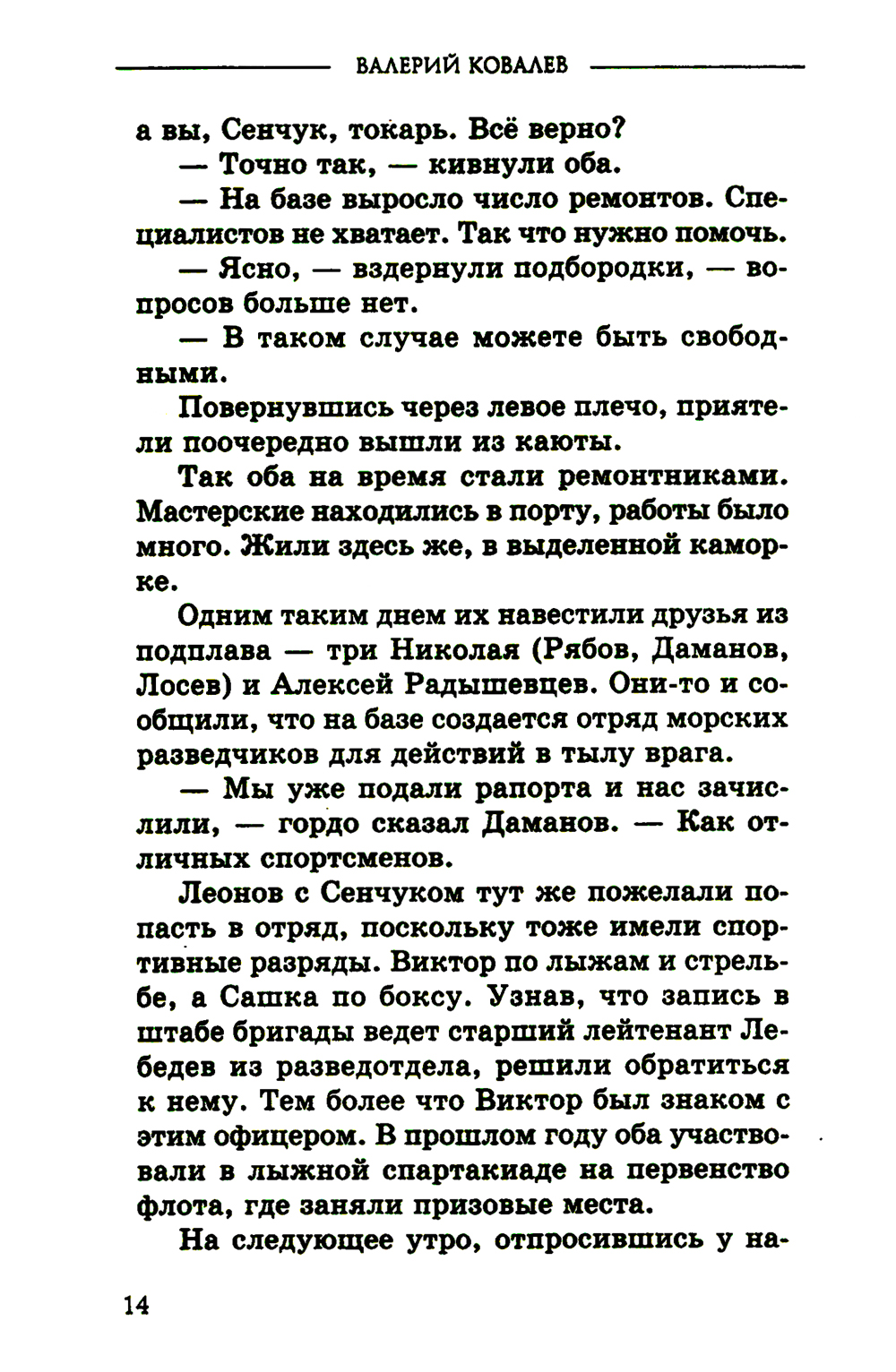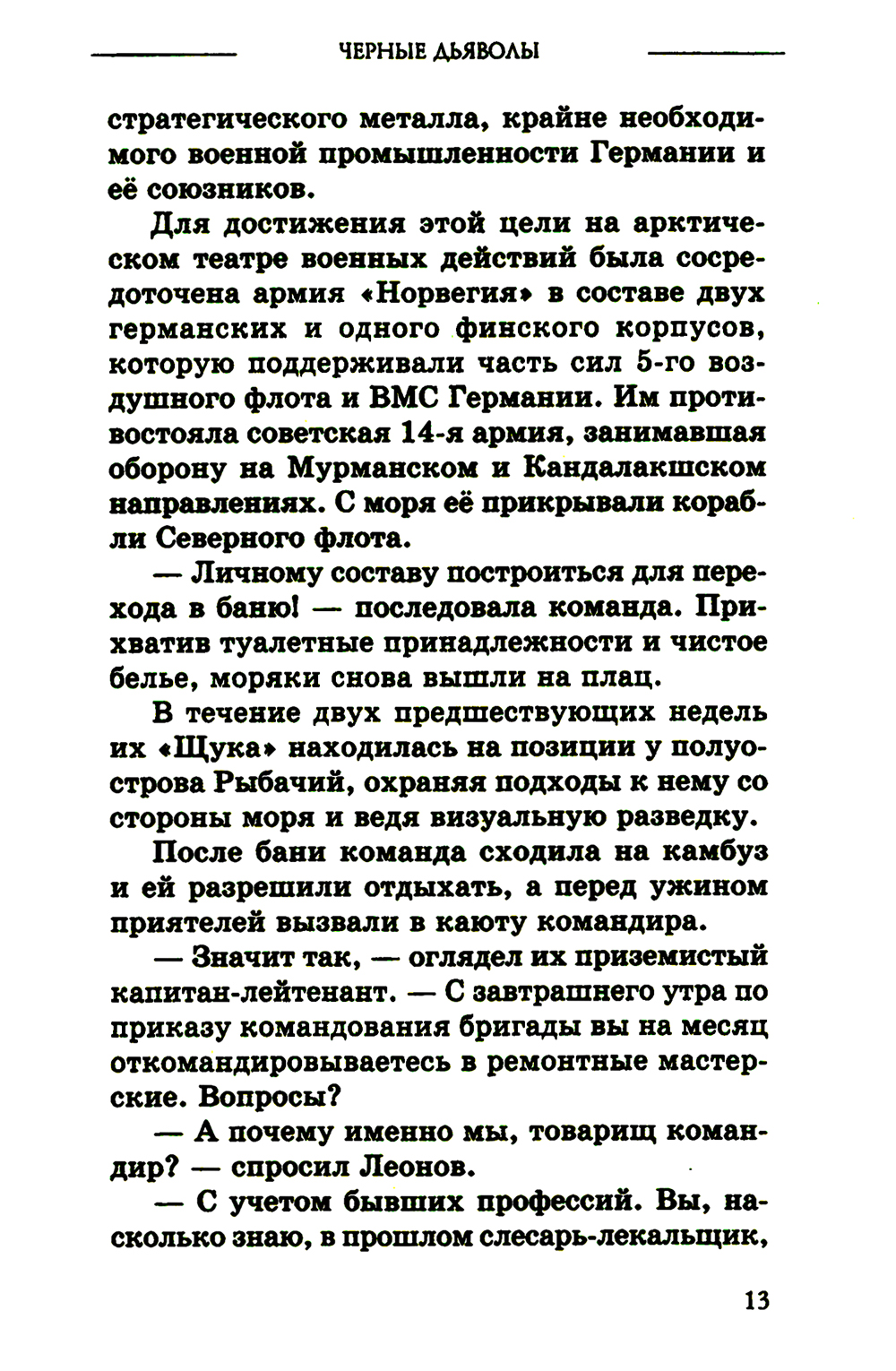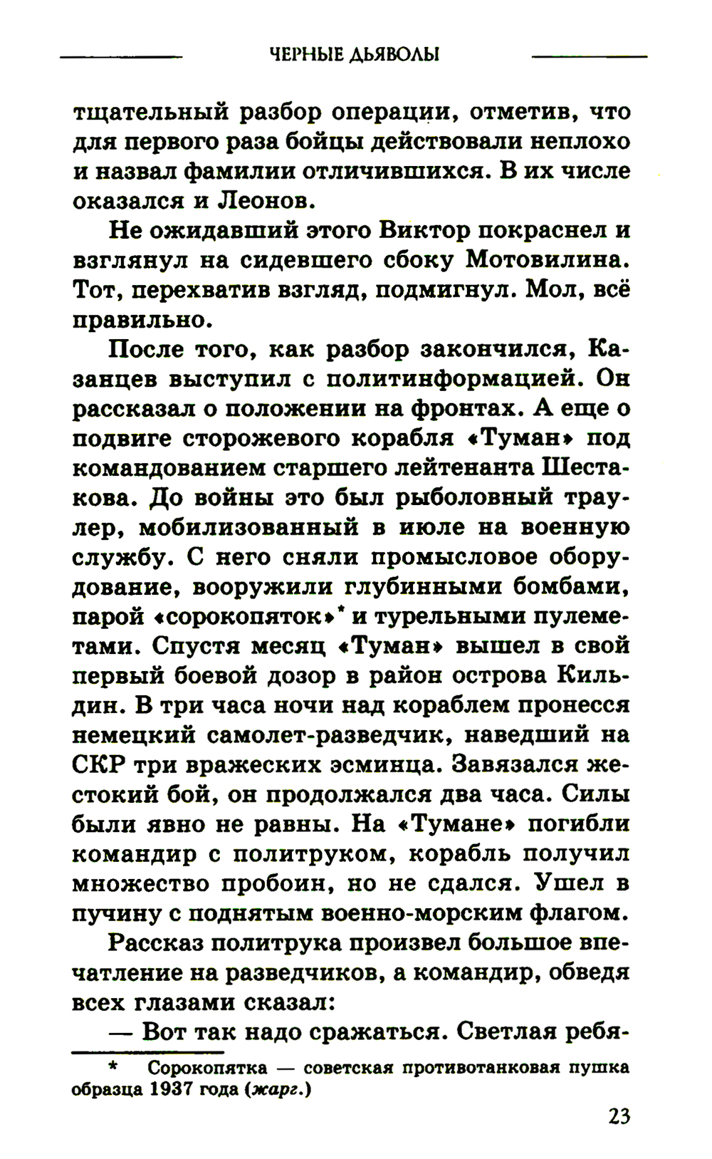 Дважды Герой Советского Союза Виктор Николаевич Леонов начал боевой путь в разведке Северного флота Он был грозой для немцев, финнов и норвежцев из горного армейского корпуса «Норвегия». «Сурте дьяволе» в переводе с норвежского означает «черные дьяволы». Так норвежцы называли советских морских разведчиков, потому что те возникали ниоткуда и, наведя ужас на фашистов, растворялись в тумане фьордов, подобно мифическим существам. Не было случая, чтобы моряки Северного флота провели свой рейд по вражеским тылам вхолостую: не добыв «языка» или секретные документы, не проведя диверсию или разведку боем. Вторую звезду Героя старший лейтенант Леонов получил в 1945 году на Дальнем Востоке за освобождение Кореи от японских захватчиков. О его славных подвигах рассказывает в своей новой книге мастер художественных биографий Валерий Ковалев, автор романов «Морской ангел», «Чистильщик», «Диверсанты» и многих других.| Издательство | Крылов |
