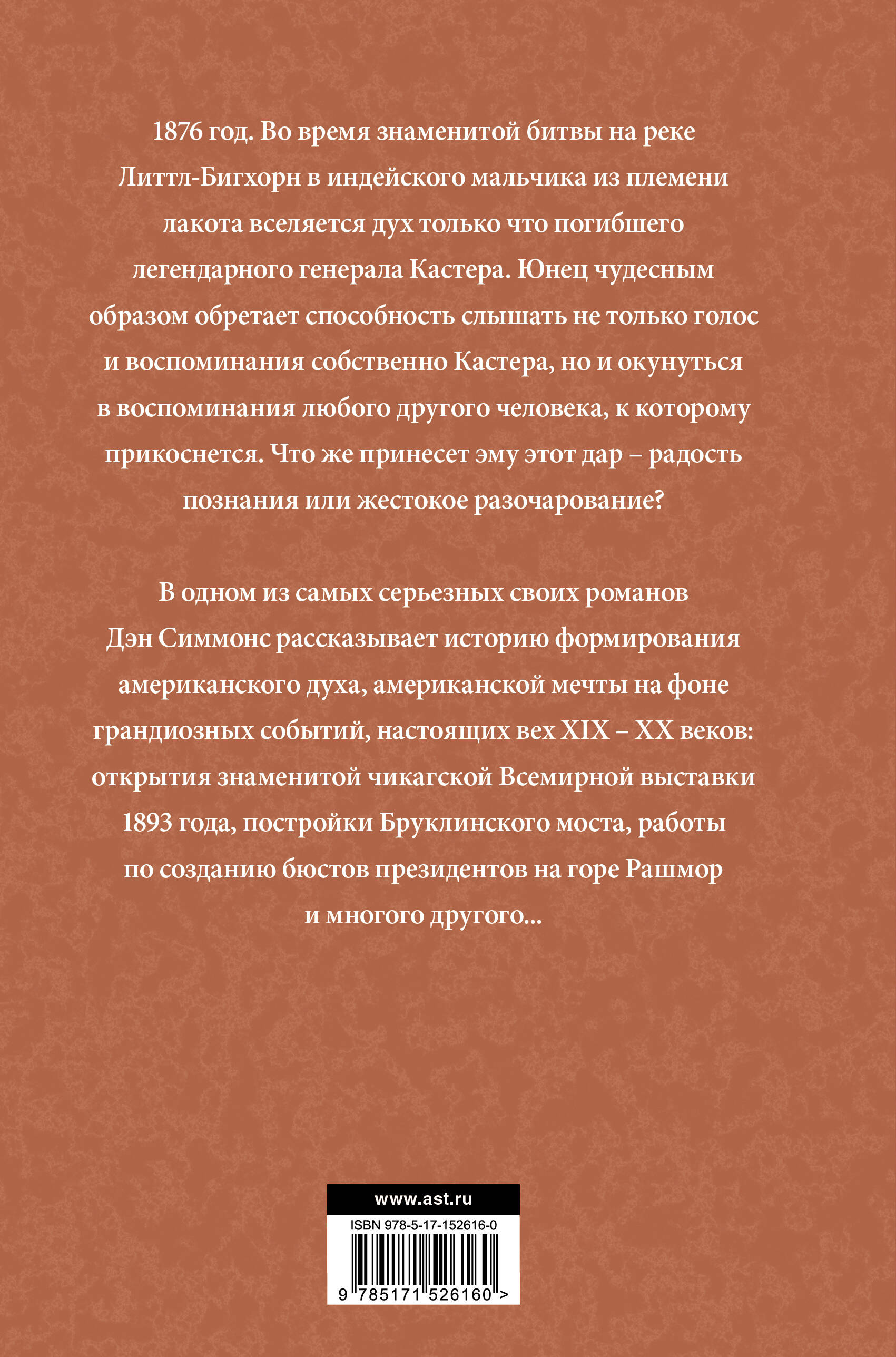 1876 год. Во время знаменитой битвы на реке Литтл-Бигхорн в индейского мальчика из племени лакота вселяется дух только что погибшего легендарного генерала Кастера. Юнец чудесным образом обретает способность слышать не только голос и воспоминания собственно Кастера, но и окунуться в воспоминания любого другого человека, к которому прикоснется. Что же принесет эму этот дар - радость познания или жестокое разочарование? В одном из самых серьезных своих романов Дэн Симмонс рассказывает историю формирования американского духа, американской мечты на фоне грандиозных событий, настоящих вех ХIХ - ХХ веков: открытия знаменитой чикагской Всемирной выставки 1893 года, постройки Бруклинского моста, работы по созданию бюстов президентов на горе Рашмор и многого другого...| Издательство | Издательство "АСТ" |