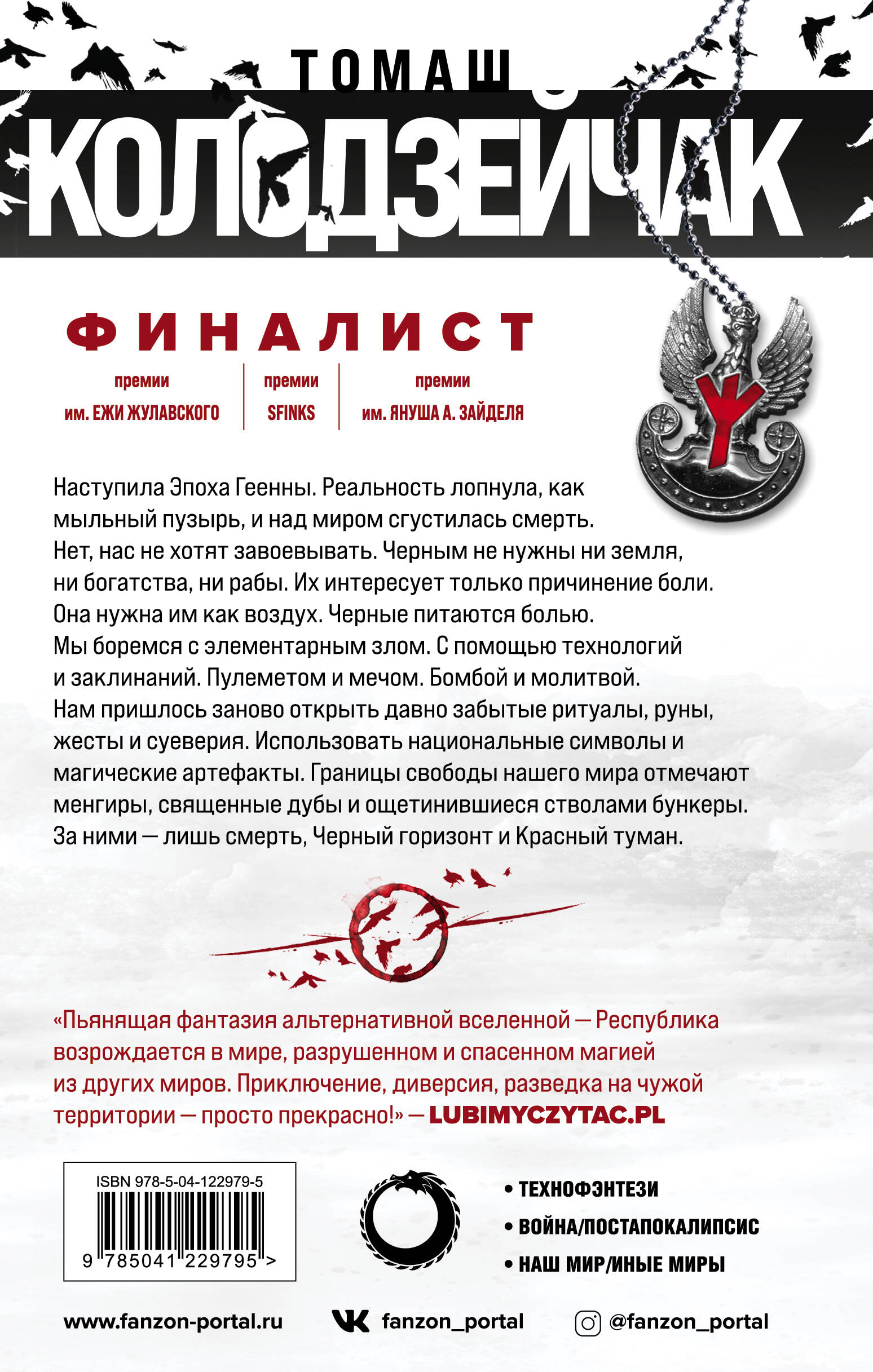 Наступила Эпоха Геенны. Реальность лопнула, как мыльный пузырь, и над миром сгустилась смерть. Нет, нас не хотят завоевывать. Черным не нужны ни земля, ни богатства, ни рабы. Их интересует только причинение боли. Она нужна им как воздух. Черные питаются болью. Мы боремся с элементарным злом. С помощью технологий и заклинаний. Пулеметом и мечом. Бомбой и молитвой. Нам пришлось заново открыть давно забытые ритуалы, руны, жесты и суеверия. Использовать национальные символы и магические артефакты. Границы свободы нашего мира отмечают менгиры, священные дубы и ощетинившиеся стволами бункеры. За ними - лишь смерть, Черный горизонт и Красный туман. Финалист премии им. Ежи Жулавского, премии им. Януша А. Зайделя, премии SFinks. «Пьянящая фантазия альтернативной вселенной - Республика возрождается в мире, разрушенном и спасенном магией из других миров. Приключение, диверсия, разведка на чужой территории - просто прекрасно!» - lubimyczytac.pl