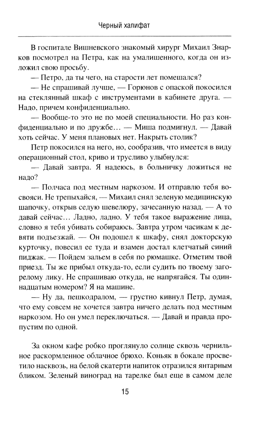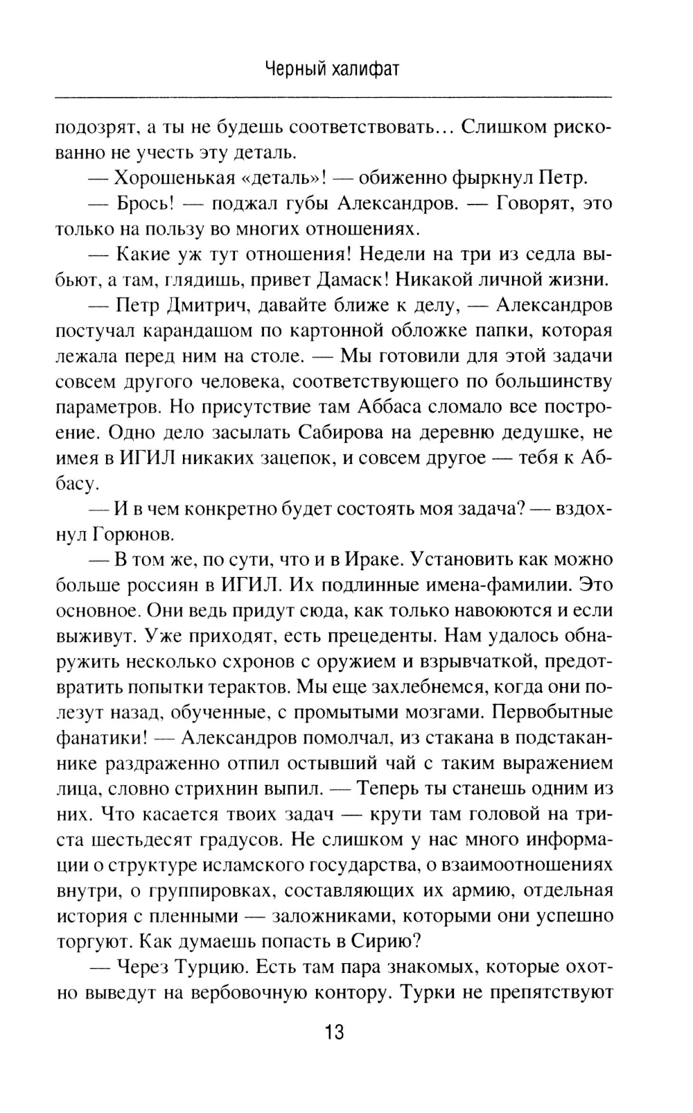 Сюжет романа «Черный халифат» разворачивается вокруг ситуации, сложившейся на Ближнем Востоке в 2013 году - вскоре после того, как началась война в Сирии. Главный герой романа - полковник Управления нелегальной разведки СВР, арабист Петр Горюнов - направлен в Сирию для внедрения в самое сердце черного халифата, в террористическую организацию, стремящуюся свергнуть законное сирийское правительство. Горюнов получил задание разведать подлинные имена и фамилии боевиков - выходцев из стран бывшего СССР, чтобы в дальнейшем предотвратить проникновение их обратно на территорию России и возникновение террористических ячеек. Полковник очень рискует, особенно, когда в дело вступает турецкая спецслужба MIT с намерением навязать ему свою опасную и жестокую игру. В романе «Держите огонь зажженным» события предыдущего романа получают логическое продолжение. Полковник Горюнов возвращается в Ирак, где долгие годы работал нелегалом. Новое задание его еще более сложное. Он водит за нос турецкие спецслужбы, для чего внедряется в ряды русского батальона Рабочей партии Курдистана в горах Кандиль в северном Ираке, обещая туркам помощь в борьбе с курдами. Турки вознамерились с помощью Горюнова устроить провокацию с химическим оружием, чтобы подставить и курдов, и сирийцев...| Издательство | Вече |